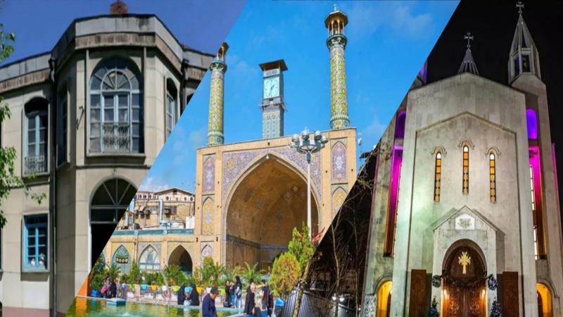 تصویری از یک کلیسا، یک مسجد و یک کنیسه در شهر تهران پایتخت ایران