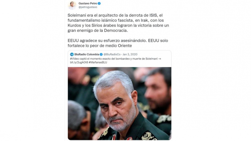 La première position du nouveau président colombien sur les États-Unis et la feuille de route qu'il peut tracer pour les relations avec Washington semble se résumer dans un tweet qu'il a récemment publié sur l’ex-chef de la Force Qods du Corps des gardiens de la Révolution islamique (CGRI), le général martyr Qassem Soleimani, en tant que leader de la lutte contre le terrorisme. Sur cette base, il a tweeté : « Soleimani est l'architecte du projet de l’élimination des fondamentalistes fascistes. »