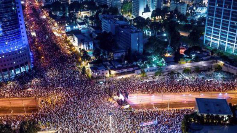 Des milliers de manifestants contre le cabinet extrémiste du régime israélien et ses politiques, y compris le plan impopulaire de réforme judiciaire de Netanyahu, se sont rassemblés samedi 8 juillet dans la ville côtière de Tel-Aviv et ailleurs dans les territoires palestiniens occupés.