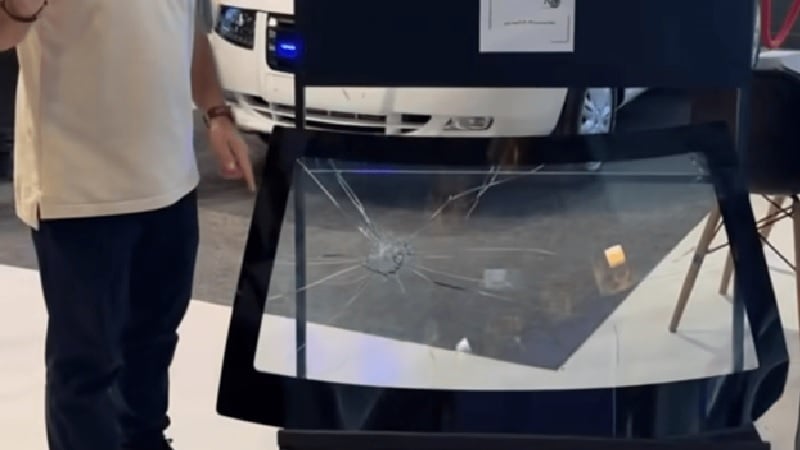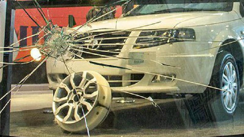 השכבה החיצונית הקשה מאטה ושוברת את הליבה החודרת של הכדור, בעוד שהשכבות הפנימיות הגמישות סופגות את האנרגיה הנותרת ומונעות משברי זכוכית להיזרק לתא הנוסעים. להלן תמונות לפני ואחרי של מבחן ירי הזכוכית ודוגמה של ניידת משטרה Samand תחת התקפה ונפגעים מהזכוכית: