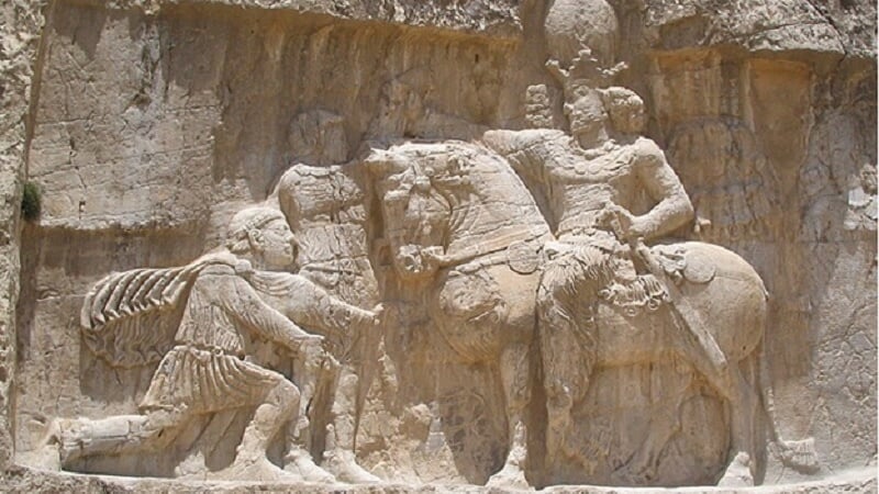 לפי צו של המלך, סצנת כריעתו מול המלך האיראני נחרטה על אב בהר.