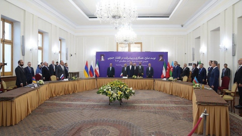 בתום המפגש השני של מתכונת "3+3", שהתקיים אתמול, שני, בטהרן בנוכחות שרי החוץ של: איראן, רוסיה, טורקיה, אזרבייג'ן וארמניה, נתפרסמה, הצהרה משותפת, בה נאמר בין השאר: לאור החשיבות של פיתוח יחסי הידידות בין המדינות על בסיס אינטרסים הדדיים והשכנות הטובה, אנו מדגישים את החשיבות לקדם הסדר שלום למחלוקות על בסיס מגילת האומות המאוחדות, כיבוד הריבונות, נעצמאות המדינית, השלמות הטריטוריאלית, כיבוד שלטון החוק והגבולות הבינלאומיים, הימנעות ההטחת איומים או שימוש בכוח וכיבוד זכויות האדם. שרי החוץ קראו להגברת התייעצויות במסגרת "3+3" קידום הדיאלוג הקונסטרקטיבי ושיתוף הפעולה בין המדינות החברות. שרי החוץ ציינו לתפקיד החיובי של שיתוף הפעולה הכלכלי בהגברת האמון ההדדי, רווחת המדינות ויציבות האזור. הם הדגישו את חשיבות שיתוף פעולה התרבותי, וביצוע פרויקטים משותפים בתחומי החינוך, המדע, התיירות, התרבות והספורט. שרי החוץ דנו גם במצב בעזה, והדגישו את הצורך להפסיק לאלתר את הפגיעה באזרחים החפים מפשע.