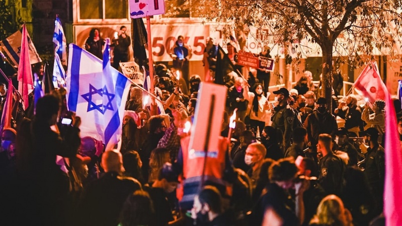 עשרות בני אדם מפגינים בסמוך לביתו של ראש הממשלה של ישראל בנימין נתניהו בקיסריה בקריאה: "אתה מחריב לנו את הבית, לא יהיה לך בית".