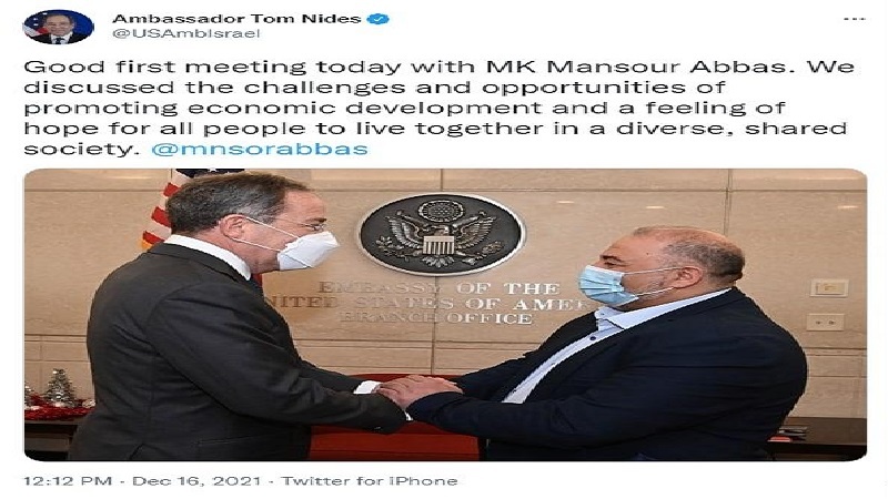 שגריר ארה"ב בישראל טוס ניידס נפגש לראשונה עם יו"ר רע"מ, חבר הכנסת מנסור עבאס. "הייתה פגישה טובה", צייץ ניידס בטוויטר. הוא טען כי הוא "דן באתגרים וההזדמנויות ובתחושת התקווה שכל האנשים יכולים לחיות יחד בחברה מגוונת ומשותפת".