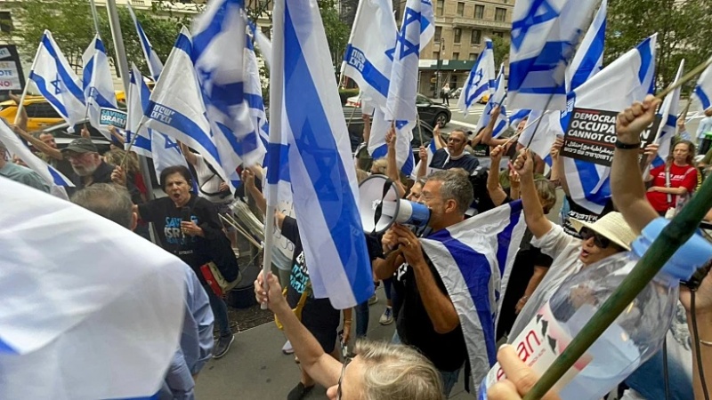 עשרות הפגינו נגד המהפכה המשפטית מחוץ למלון שבו שוהה שר המלחמה יואב גלנט בניו יורק, לשם הגיע כדי להשתתף באירוע התרמה ולהיפגש עם בכירים באו"ם.