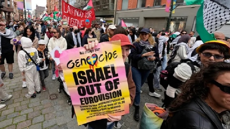 מפגינים בתמיכת הפלסטינים מוחים נגד השתתפותה של המתמודדת הישראלית עדן גולן לפני גמר האירוויזיון במאלמו, שבדיה
