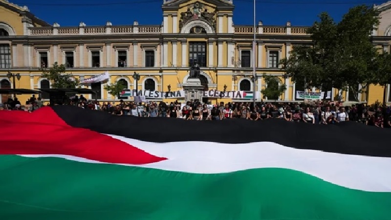 סטודנטים מפגינים מול בניין אוניברסיטת צ'ילה בסנטיאגו בתמיכה בפלסטינים ונגד מלחמת ישראל על עזה