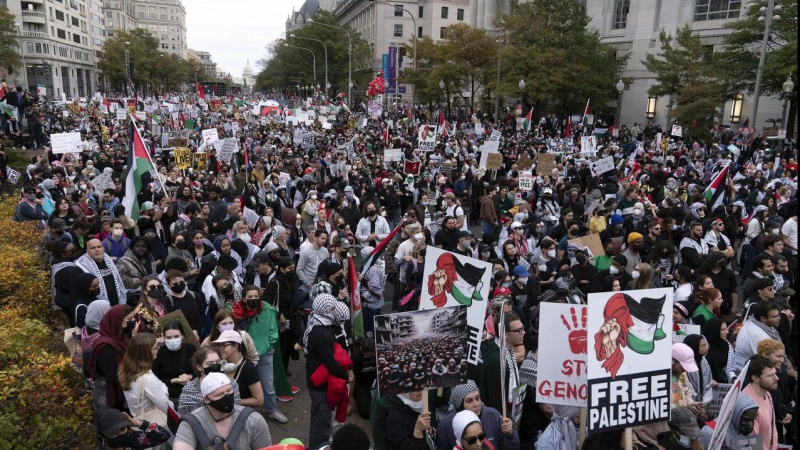 כ-60 מפגינים פרו-פלסטינים נעצרו בבניין גבעת הקפיטול בוושינגטון הבירה, שבו מחאות אסורות לפי החוק האמריקני.