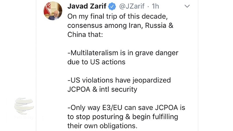 विदेशमंत्री मुहम्मद जवाद ज़रीफ़ ने अपनी मास्को और बीजिंग की यात्रा की समाप्ति पर ट्वीट किया कि साल के अंतिक सफ़र में ईरान, रूस और चीन के बीच इन विषयों पर सहमति हुई कि अमरीकी प्रतिबंधों की वजह से बहुपक्षीयवाद गंभीर ख़तरे में पड़ गया है, इसी प्रकार अमरीका के उल्लंघनों ने परमाणु समझौते और अंतर्राष्ट्रीय सुरक्षा को भी ख़तरे में डाल दिया है।
