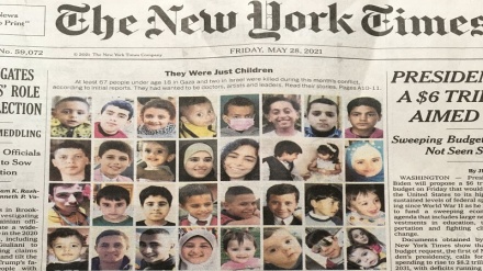 May २९, २०२१ १८:४४अमरीकी समाचार पत्र न्यूयार्क टाइम्ज़ ने ग़ज़्ज़ा युद्ध के दौरान शहीद होने वाले 64 बच्चों की तस्वीरें अपने फ़्रंट पेज पर छापी है।