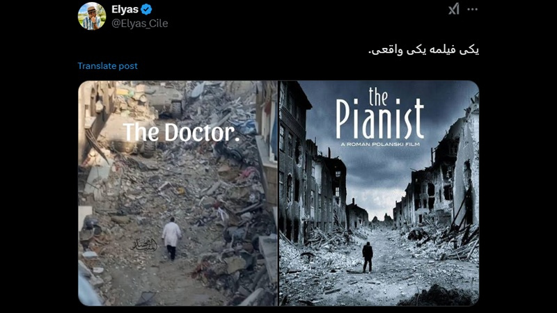 X के यूज़र इल्यास ने हालीवुड की एक फ़िल्म "PIANIST" की एक तस्वीर की तुलना ग़ाज़ा में कमाल उदवान अस्पताल के प्रमुख डा᳴क्टर हेसाम अबू सफ़िया की विरोध जताने वाली तस्वीर से की है और लिखा है कि एक फ़िल्म है और वास्तविक तस्वीर है।