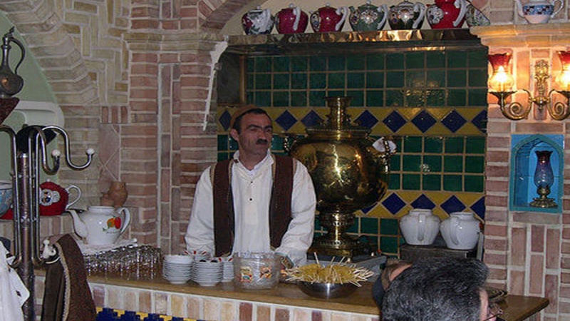 रेस्तोरा की गोल मेज़ें इस्फ़हान की क़लमकारी की कला से सजाई गई हैं और लोगों के विश्राम के लिए तख़्त बिछे हुए हैं जिन पर क़ालीन बिछे रहते हैं। रेस्तोरां के दरवाज़े पर साज़न्दे पारंपरिक साज़ लिए ख़ड़े रहते हैं। साज़ंदों के लिए एक और विशेष स्थान भी है जहां बड़ी चहल पहल रहती है।