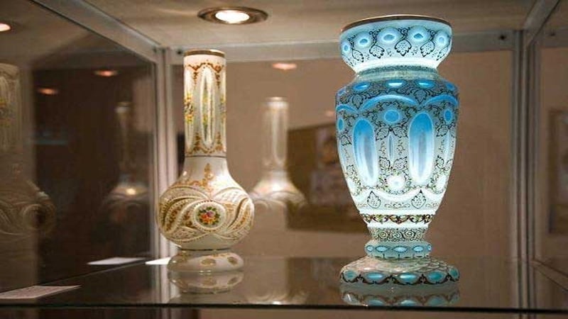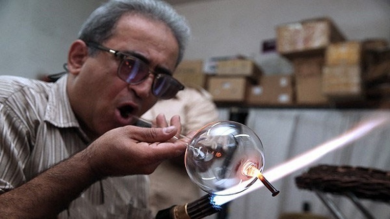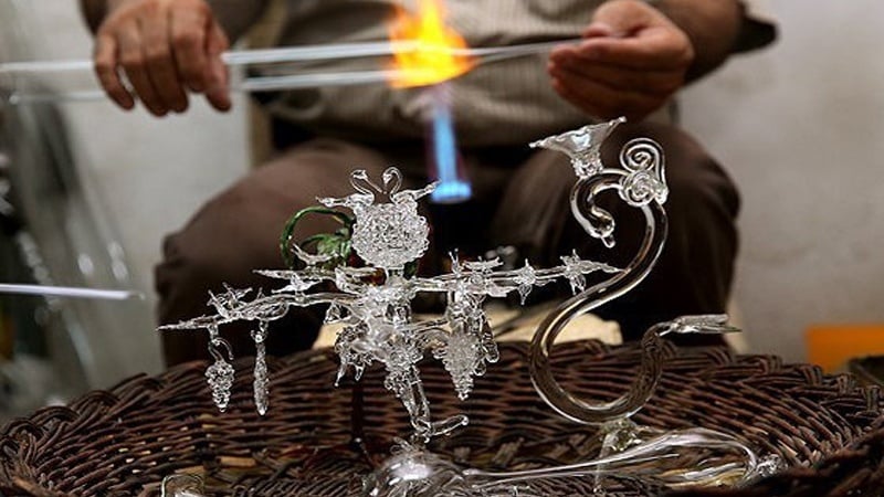 हस्तकला उत्पादों में से एक शीशे की कला है। शीशे की कला में शीशे को विभिन्न रूप दिए जाते हैं। हाथ से तैयार किए जाने वाले शीशों का इतिहास क़रीब 4 हज़ार साल पुराना है। कलाकार शीशे के पदार्थ को पहले आग पर तपाते हैं, ताकि वह पिघल जाए। उसके बाद उसमें फूंकने के लिए विशेष पाइप का प्रयोग करते हैं और शीशे की कला में इस्तेमाल होने वाले उपकरणों का प्रयोग करके शीशे को बर्तन या सजावटी चीज़ों के रूप में ढालते हैं। यह सामूहिक काम होता है, जिसमें काफ़ी महारत की ज़रूरत होती है। शीशे की एक वस्तु के उत्पाद में डिज़ाइन और रंग करने वाला, फूंकने वाला, पिघले हुए पदार्थ को उंडेलने वाला और उसे सांचे में ढालने वाला भाग लेते हैं।