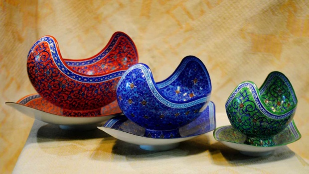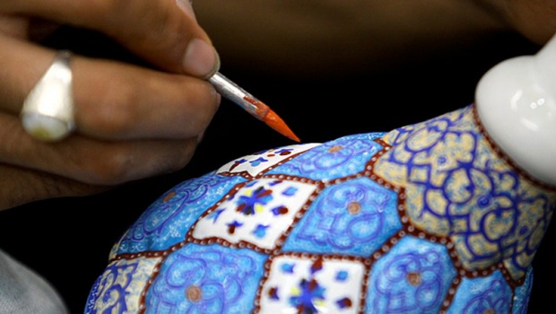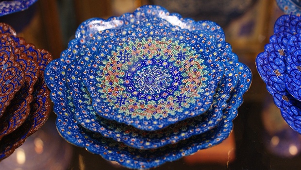 आज ईरान में मीनाकारी के उत्पादन का केन्द्र इस्फ़हान है और उसके बाद शीराज़ का स्थान है। मीनाकारी के बर्तनों पर प्राचीन समय के बहुत से चित्र अब इसलिए प्रचलित नहीं हैं क्योंकि उनके बनाने में बहुत मेहनत जाती है। उकेरे हुए, फूल बूटे, इस्लीमी शैली में बने फूल और मुर्ग़ के चित्र, मीनाकारी व मिनिएचर कला के संयुक्त चित्र तथा पुरानी इमारतों के चित्र अब मीनाकारी के बर्तनों पर प्रचलित हैं।