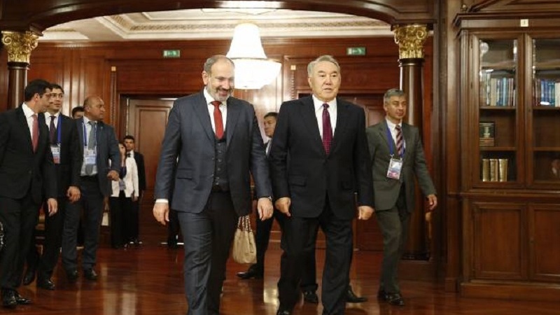 Ինչպես «Արմենպրես»-ին տեղեկացրին ՀՀ կառավարության տեղեկատվության և հասարակայնության հետ կապերի վարչությունից, ողջունելով Հայաստանի վարչապետին Ղազախստանի Հանրապետությունում` Նուրսուլթան Նազարբաևը նշել է.«Հարգելի Նիկոլ Վովայի, շնորհակալություն, որ եկել եք մասնակցելու Եվրասիական տնտեսական միության հոբելյանական գագաթնաժողովին: Ղազախստանի ու Հայաստանի միջև երբևէ որևէ խնդիր չի եղել, ունեցել ենք լավ հարաբերություններ: Հայկական սփյուռքը կամուրջ է հանդիսանում, այստեղ ապրող հայերը մեր քաղաքացիներն են՝ ղազախստանցիներ են: Նրանք միավորում են մեզ: Վերջին շրջանում մեր երկրների միջև առևտուրն աճել է, բայց վատ լոգիստիկայի պատճառով այն տուժում է: Մենք փոխանակելու բան ունենք. այն, ինչ դուք ունեք, մենք չունենք, ինչ մենք ունենք, դուք չունեք, այդ իսկ պատճառով այդ ուղղությամբ պետք է աշխատել:Դուք գիտեք, որ ես, խորը մտածելով, ընդունեցի այդ որոշումը: Երբ կհասնեք իմ փորձին և տարիքին, ավելի լավ կհասկանաք ինձ: Հունիսի 20-ին կլրանար իմ՝ Ղազախստանի ղեկավար լինելու երեսուն տարին: Այն ժամանակ դեռ Խորհրդային Միությունն էր: 1989 թվականին ես ընտրվեցի Ղազախստանի Կոմունիստական կուսակցության առաջին քարտուղար, իսկ մինչ այդ ես կառավարության ներկայացուցիչ էի: Այդ պատճառով շատ եմ աշխատել, շատ բան եմ տեսել, ողջ Ղազախստանն է ինձ ճանաչում, և անկախության վերջին տարիներին մենք շատ բան կարողացանք անել` փաստացիորեն բարձրացնել Ղազախստանի վարկը, երկիրը հայտնի դարձնել ամբողջ աշխարհին: Եվ ես համարեցի, որ եկել է ղեկավարի պաշտոնը հանգիստ փոխանցելու ժամանակը: Միևնույն ժամանակ, շարունակում եմ աշխատել: Կասիմ-Ժոմարտ Տոկաևը 30 տարի ինձ հետ աշխատում է, ես նրան գիտեմ, շատ պատրաստված և կիրթ անձնավորություն է: Վստահ եմ, որ Հայաստանի հետ մեր հարաբերությունները կլինեն նույնքան լավ, ինչպես և մինչ այդ էին»:Շնորհակալություն հայտնելով Նուրսուլթան Նազարբաևին ջերմ ընդունելության համար՝ Հայաստանի վարչապետ Նիկոլ Փաշինյանը նշել է. «Շնորհակալ եմ Նուրսուլթան Աբիշի: Իհարկե, ուրախ եմ Ձեզ տեսնել և այցելել Ձեր երկիր, որի մայրաքաղաքը Դուք եք կառուցել: Դուք քաղաքական առաջնորդ եք, ով մի ամբողջ ժամանակաշրջան է խորհրդանշում: Դուք հիշատակեցիք, որ դեռևս խորհրդային տարիներին Ղազախստանի առաջնորդն էիք: Դուք առաջիններից էիք ղեկավարներից, ով ստորագրեց Բելովեժյան համաձայնագիրը, դրանից հետո Դուք մասնակցություն ունեցաք ԱՊՀ ստեղծման գործընթացին, ապա ակտիվ մասնակցություն եք ունեցել ՀԱՊԿ ստեղծման գործում: Հայաստանը հանդիսանում է ԱՊՀ անդամ և ՀԱՊԿ հիմնադիր անդամ: Բոլորին քաջ հայտնի է, որ Դուք առաջարկեցիք եվրասիական ինտեգրացիայի գաղափարը: Այս տարի լրանում է այդ իրադարձության 25-ամյակը և ԵԱՏՄ ստեղծման մասին պայմանագրի 5-ամյակը: Իհարկե, մենք մեծ հուզմունքով ենք հետևում իրադարձություններին, որոնք տեղի են ունենում Ղազախստանում, և այն մեծ քաղաքական փոփոխություններին, որոնք Դուք նախաձեռնել եք:Մենք համոզված ենք, որ այն, ինչ Դուք նախաձեռնել եք, արվում է ի շահ Ղազախստանի և ղազախ ժողովրդի: Իհարկե, Սահմանադրությամբ Դուք շարունակում եք մնալ ազգի առաջնորդը, և Անվտանգության խորհրդի նախագահը: Դուք կշարունակեք ակտիվ դերակատարում ունենալ ԵԱՏՄ-ում, և վաղը մենք այդ մասին համապատասխան որոշում կընդունենք: Ի սկզբանե ես պաշտպանում էի այդ գաղափարը, և վստահ եմ, որ Ղազախստանի նոր նախագահի հետ մենք կունենանք նույնպիսի ջերմ և կառուցողական հարաբերություններ: Այո, մեր երկրների միջև առկա են շատ լավ քաղաքական հարաբերություններ, ցավոք, տնտեսության ոլորտում բավական փոքր ծավալներ ունենք: Կարծում եմ, որ հիմա կա հնարավորություն այդ ուղղությամբ աշխատելո