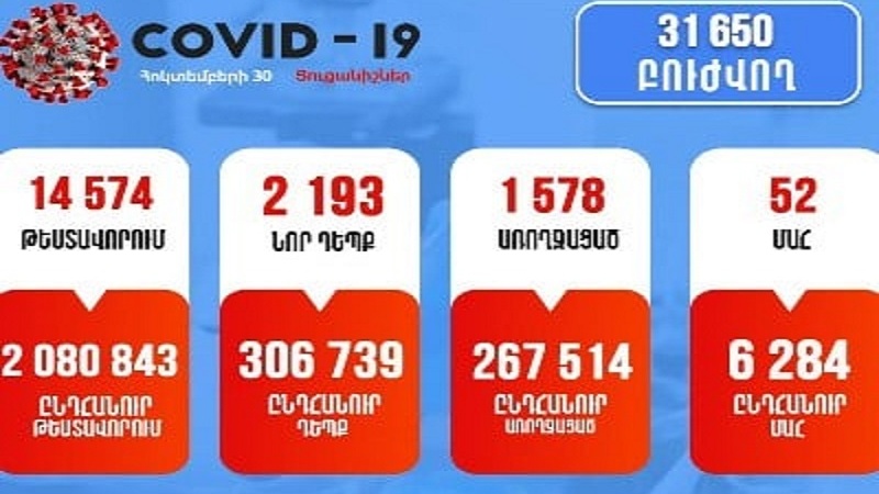 Հայաստանում հոկտեմբերի 30-ին՝ ժամը 11:00-ի դրությամբ նոր կորոնավիրուսով վարակվելու 2193 նոր դեպք է գրանցվել, վարակվածների ընդհանուր թիվը հասել է 306 739 դեպքի: