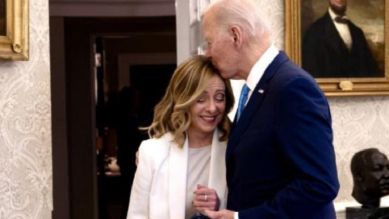 ԱՄՆ նախագահ Ջո Բայդենը Սպիտակ տան Օվալաձև աշխատասենյակում աշխատանքային հանդիպումից հետո Իտալիայի վարչապետ Ջորջիա Մելոնիին հրաժեշտ տալիս համբուրել է կնոջ գլուխը: X սոցիալական ցանցի օգտատերերը Բայդենի համբույրն անվանել են «նոր դիվանագիտական թրենդ»: