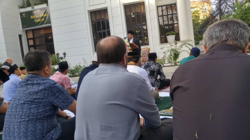 Perayaan Hari Raya Idul Adha di Wisma KBRI Tehran berlangsung khidmat dan meriah. Wajah para jemaah tampak berseri-seri dan bergembira di hari tersebut. Dubes RI untuk Tehran Octavino Alimudin terlihat di shaf pertama, tak jauh dari Dubes al-Zawawi.