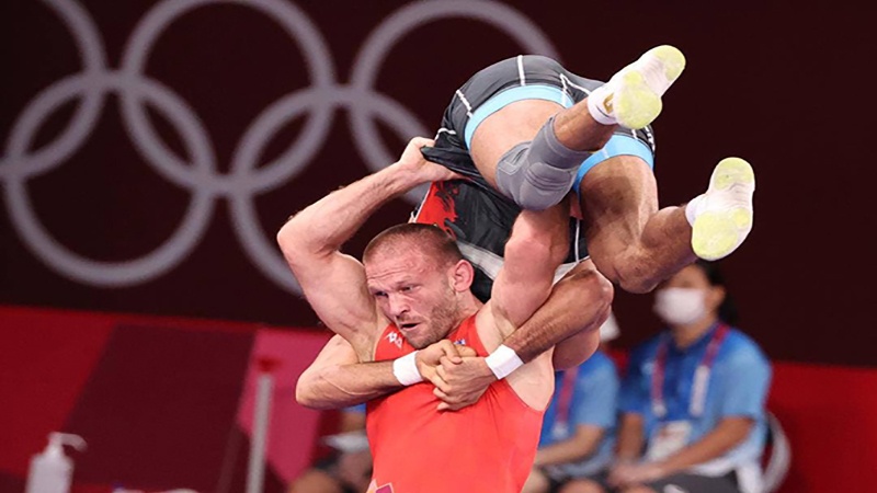 Pegulat Iran kelas berat 77 kg, Mohammadali Geraei menggunakan teknik tupai terbang (Flying Squirrel) untuk menjatuhkan lawan pada laga Olimpiade Tokyo 2020.