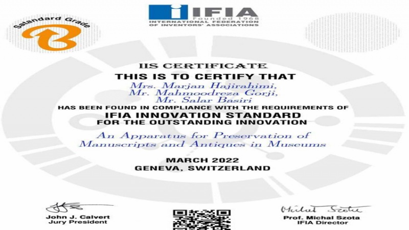 Inovasi tim Iran yang terdiri dari Marjan Hajirahimi, Mahmoodreza Gorji, dan Salar Basiri berhasil mendapatkan sertifikat IIS dengan nilai B atas inovasinya. Ini adalah untuk pertama kalinya di Iran dan dunia, penemuan baru di bidang teknologi museum, berhasil meraih sertifikat IFIA. (HS)