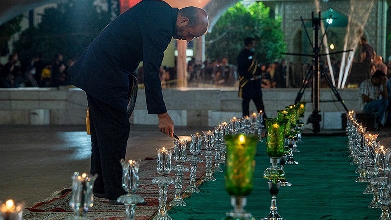 Warga kota Tabriz, provinsi Fars, Republik Islam Iran menghadiri acara Sham-e Ghariban (malam orang-orang yang terasing) di Kompleks Haram Suci Shahcheragh pada Senin malam, 8 Agustus 2022.