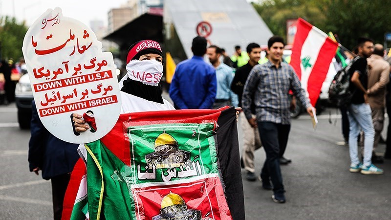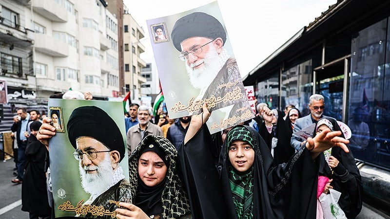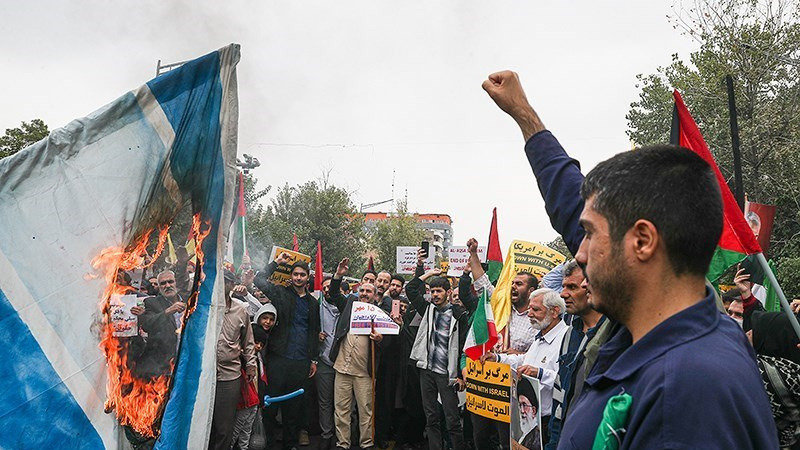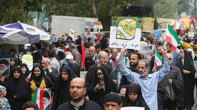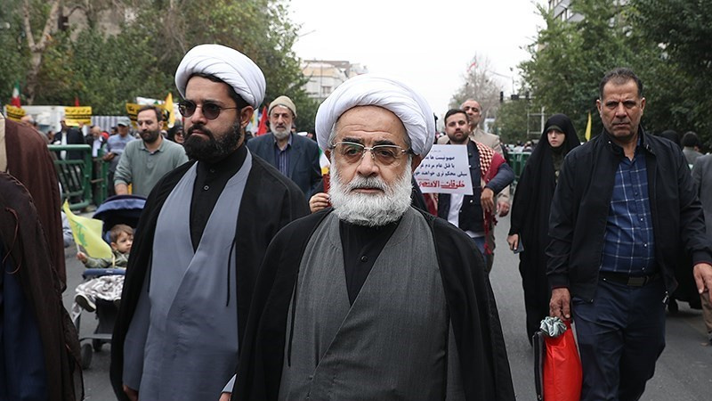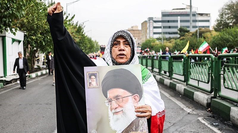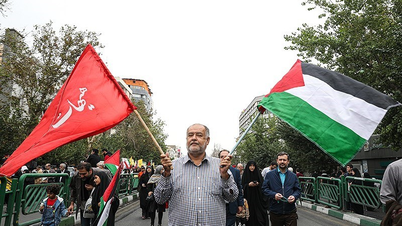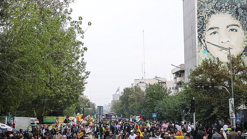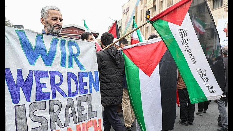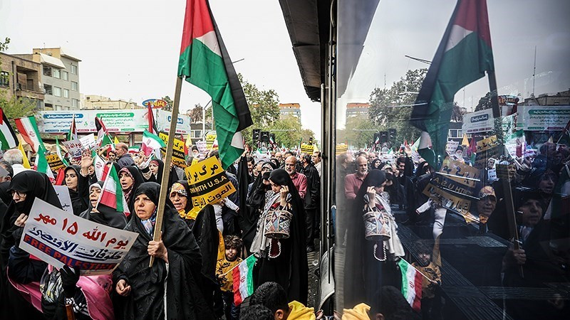 Unjuk rasa itu digelar sebelum salat Jumat dan bersamaan dengan pawai akbar di barbagai provinsi di Iran pada Jumat (13/10/2023) pagi.