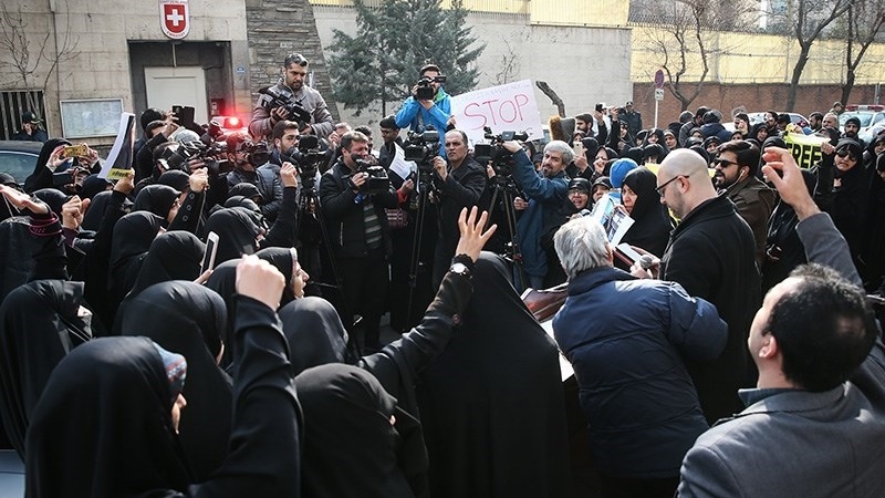 Ratusan aktivis, mahasiswa dan awak media dan budaya serta berbagai lapisan masyarakat menggelar unjuk rasa di depan Kedutaan Besar Swiss (penjaga kepentingan luar negeri Amerika Serikat) di Tehran, ibu kota Republik Islam Iran.