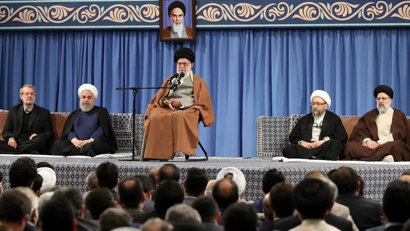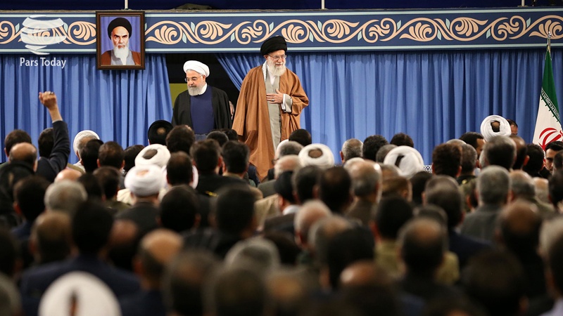 Tentu saja, kekuatan arogan dan yang berada di puncak piramida ini adalah Amerika Serikat pelaku kejahatan telah melakukan segalanya di tahun-tahun setelah kemenangan revolusi untuk menyerang Iran, tetapi plot-plot ini tidak dapat menghentikan bangsa Iran untuk terus berjalan. Tidak diragukan lagi bahwa bangsa Iran memiliki kemampuan untuk mengalahkan kesulitan dan kesusahan dengan adanya sanksi dan tantangan dan tetap dapat melanjutkan jalannya dengan penuh kepercayaan serta pasti akan mengalahkan musuh-musuh, yakni Amerika Serikat dan kaki tangannya serta akan mencapai kemenangan.