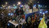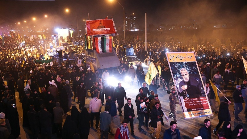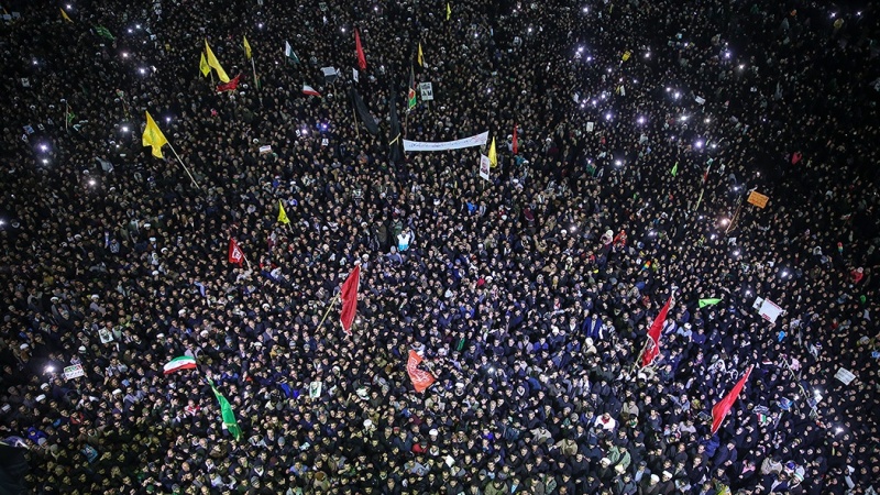 Lautan manusia memadati jalan-jalan di kota Qom, Republik Islam Iran untuk menghadiri tasyi' jenazah Komandan Pasukan al-Quds Garda Revolusi Islam Iran (IRGC) Letnan Jenderal Qassem Soleimani dan beberapa syuhada lainnya pada Senin malam, 6 Januari 2020.