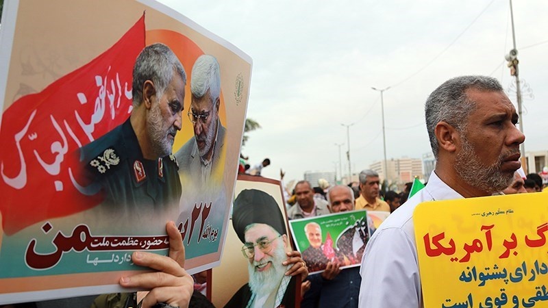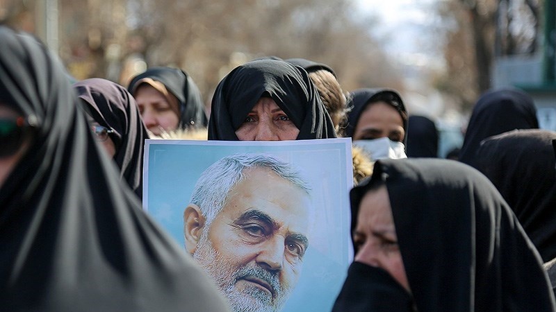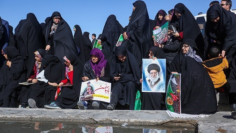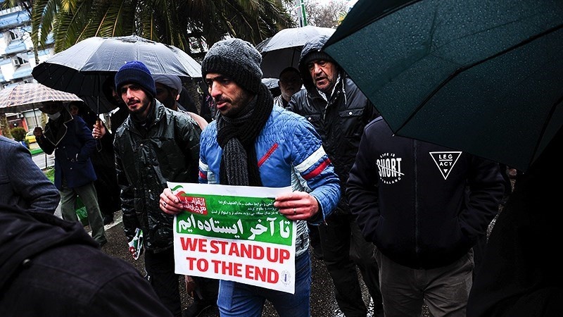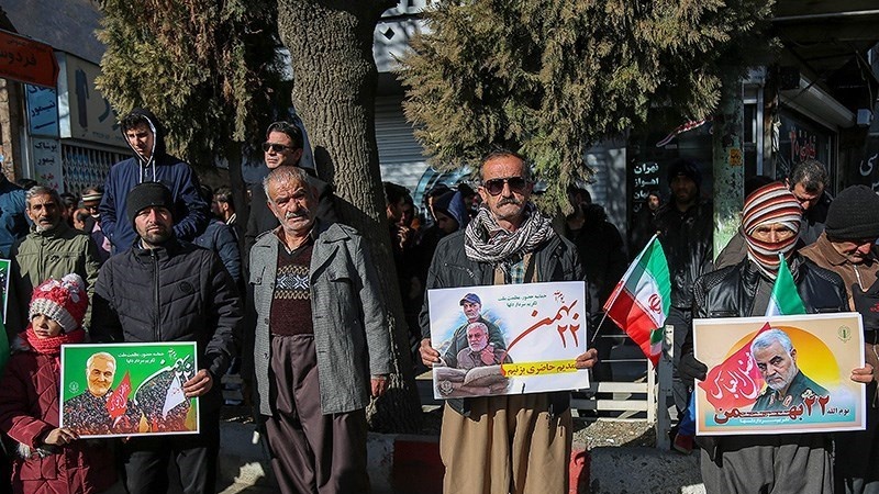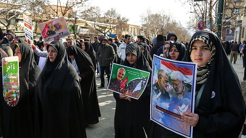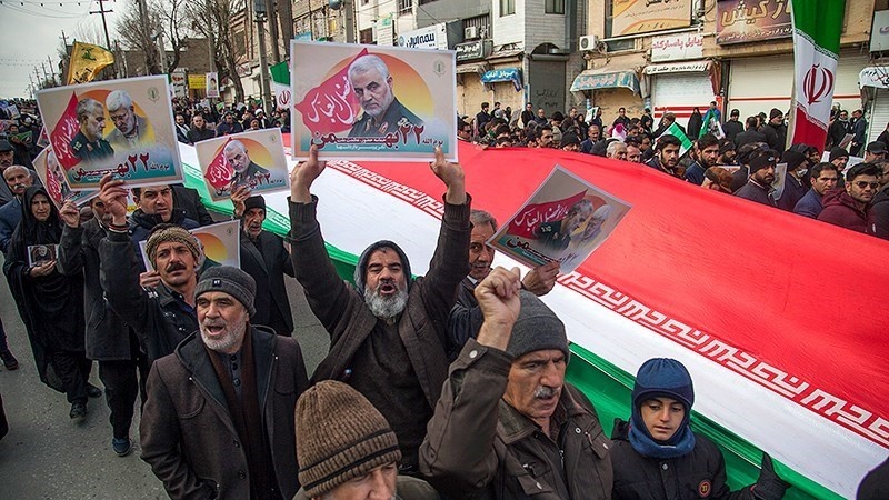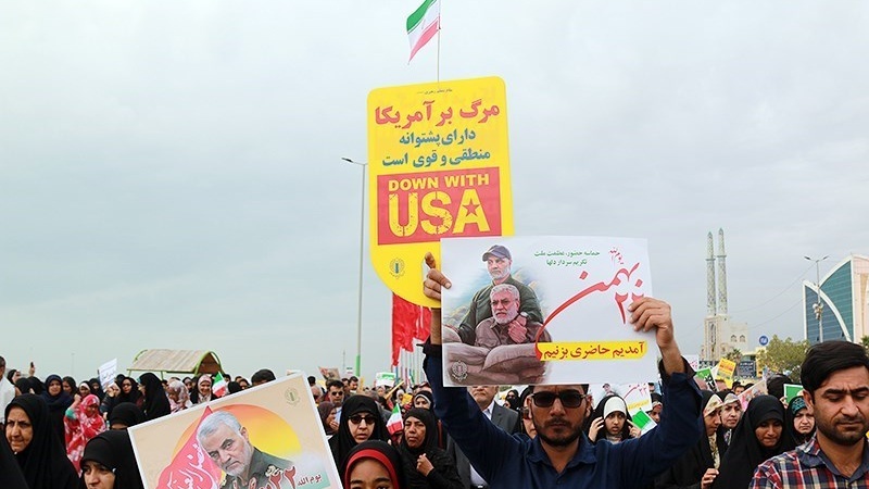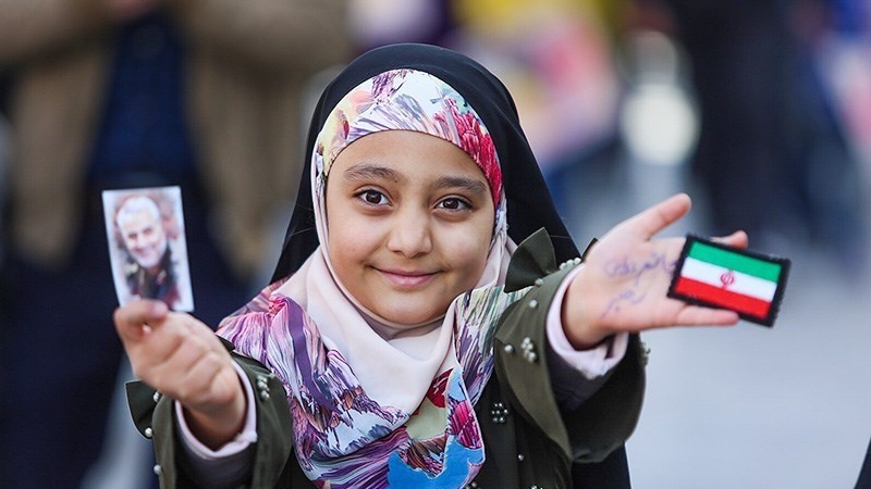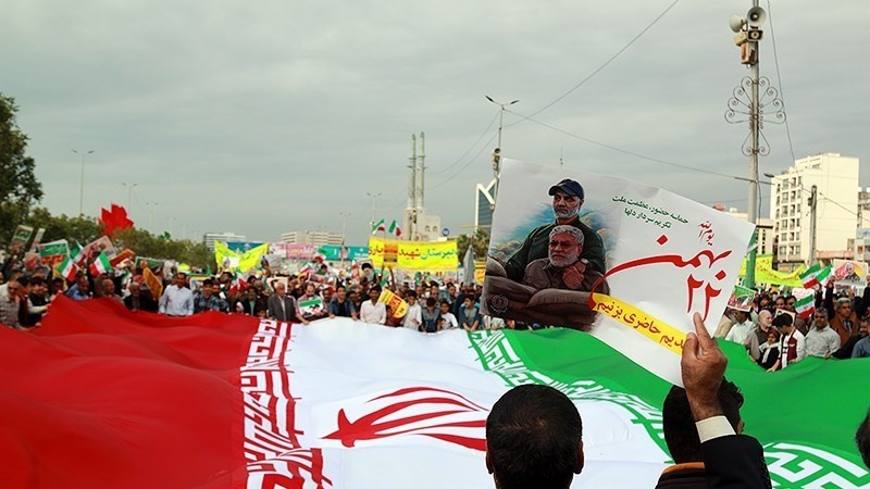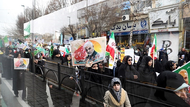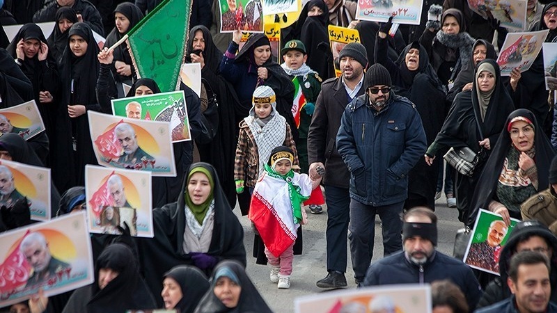 Para peserta pawai yang membawa bendera Iran, dan foto Syahid Soleimani, membedakan pawai 22 Bahman tahun ini dengan tahun-tahun sebelumnya.