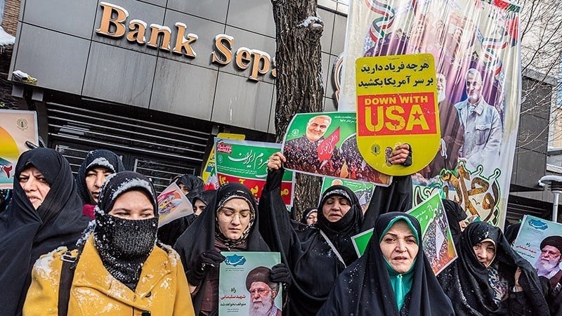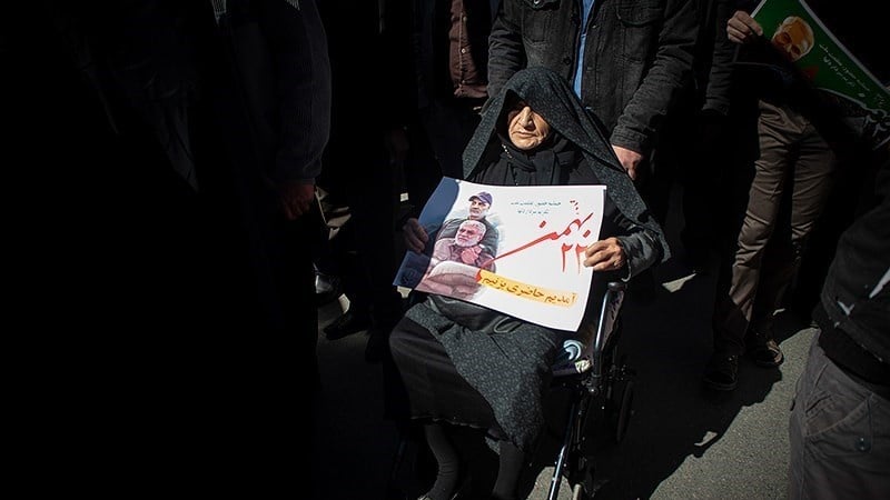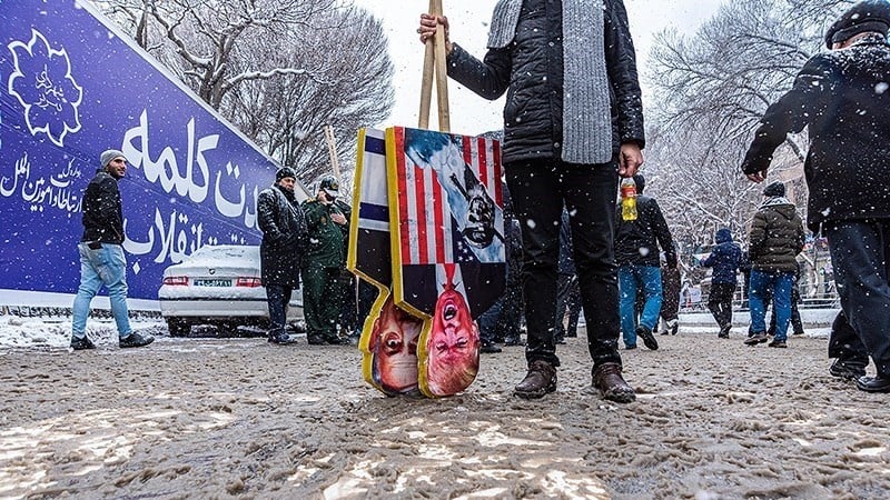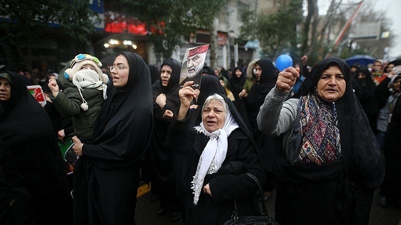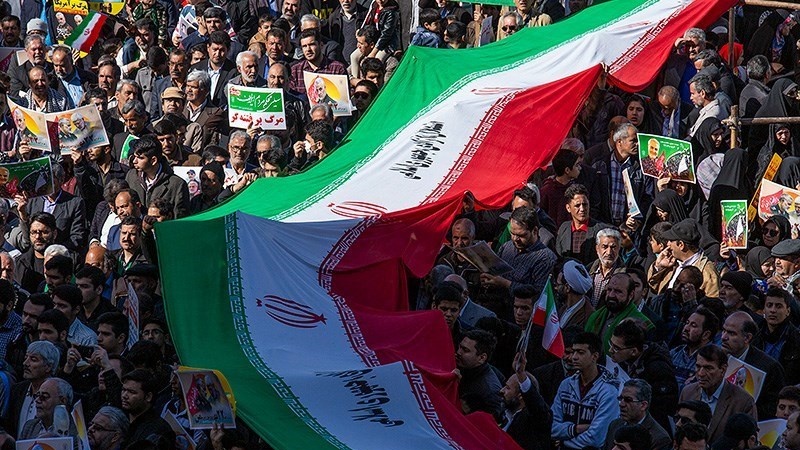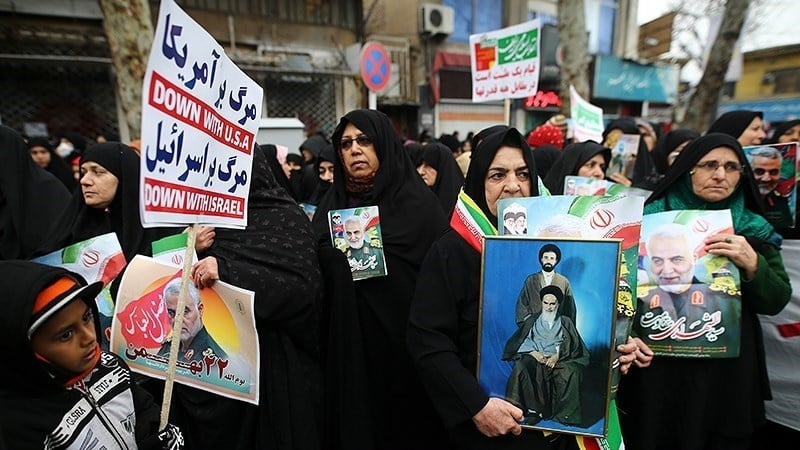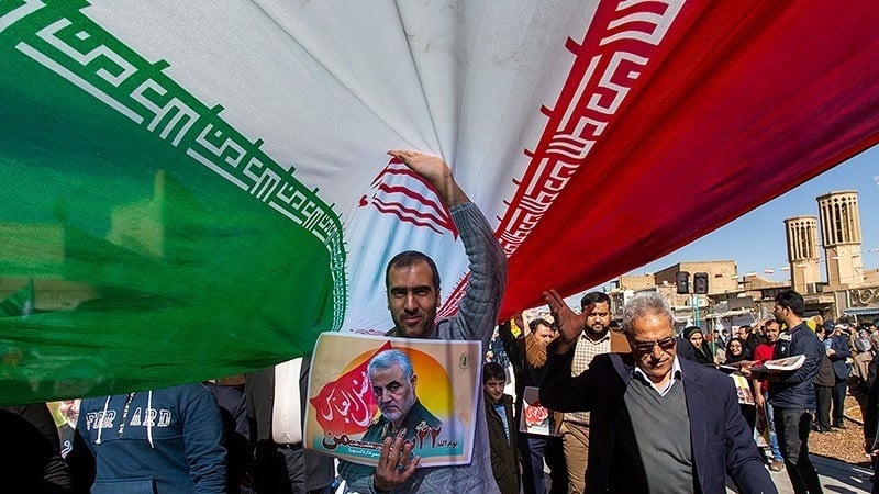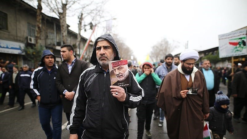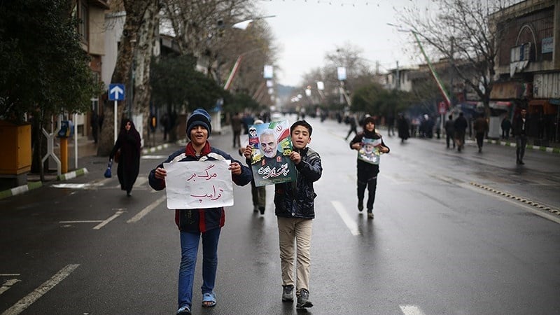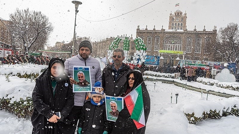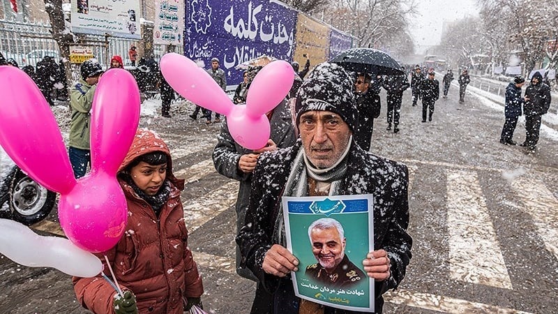 Para peserta pawai yang membawa bendera Iran, dan foto Syahid Soleimani, membedakan pawai 22 Bahman tahun ini dengan tahun-tahun sebelumnya.