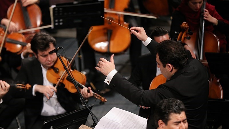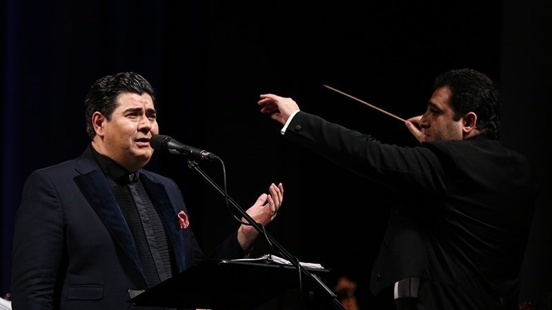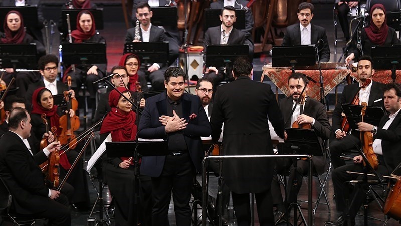 Orkestra Nasional Iran yang dipimpin oleh Sohrab Kashif, dan penyanyi Salar Aghili serta Penyanyi Parvaz Homay tampil di malam ketujuh Festival Musik Fajr ke-35 yang berlangsung di Vahdat Hall, Tehran. (RA)