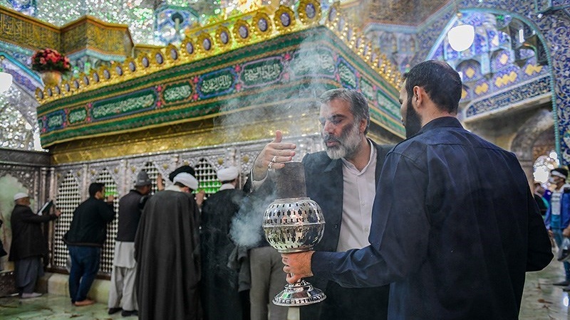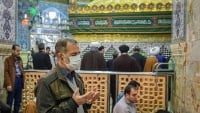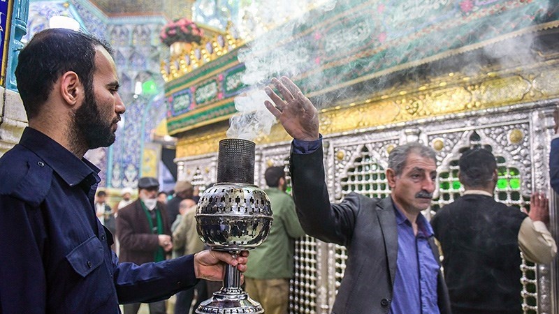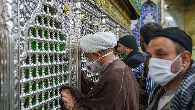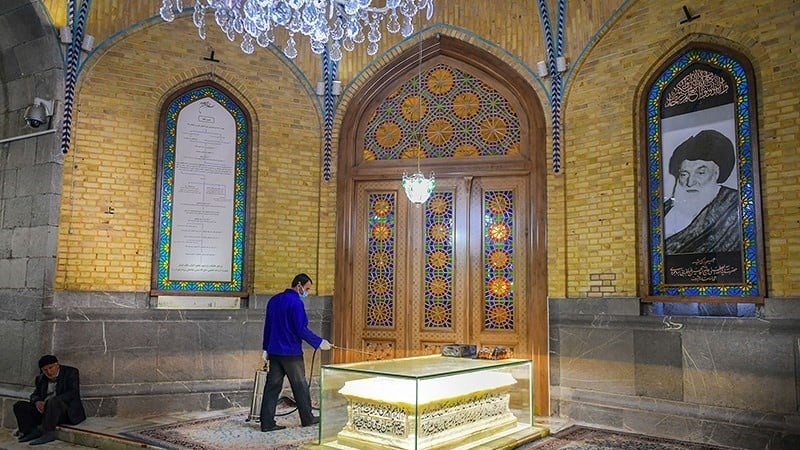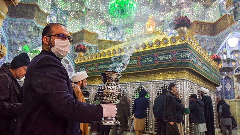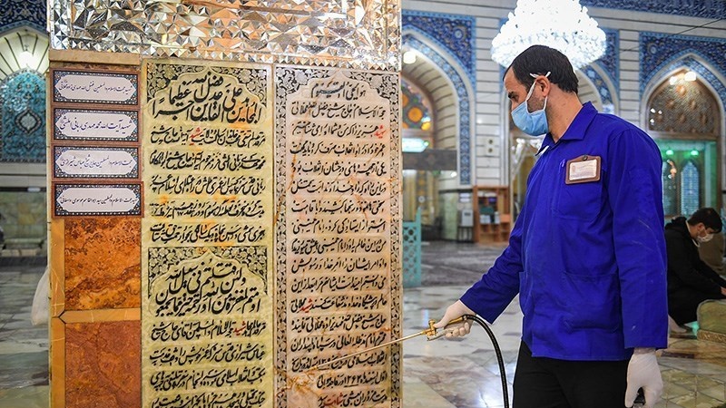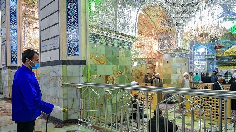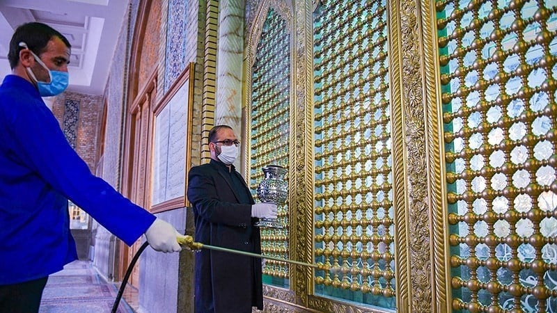 Petugas pemerintah kota Qom, Republik Islam Iran menyemprot Kompleks Makam Sayidah Fatimah Maksumah sa dengan cairan khusus (disinfektan) untuk mencegah penyebaran Virus Corona.