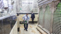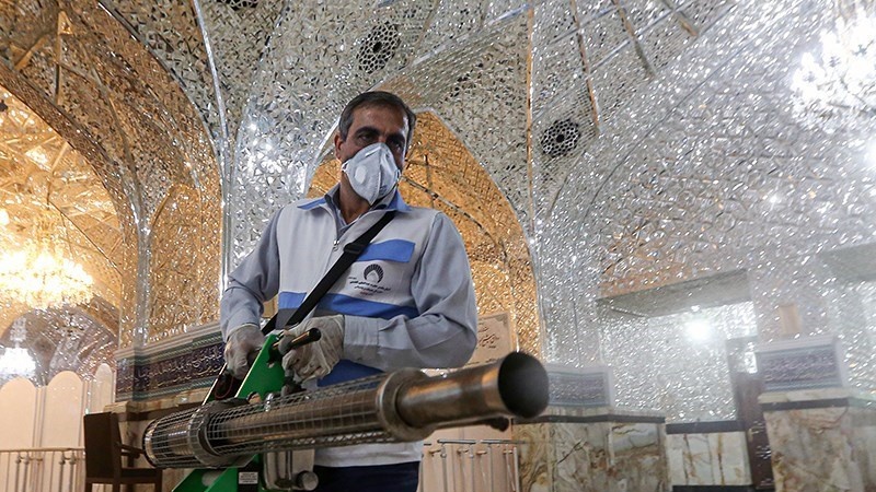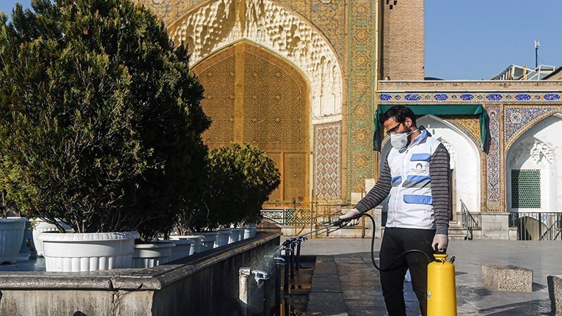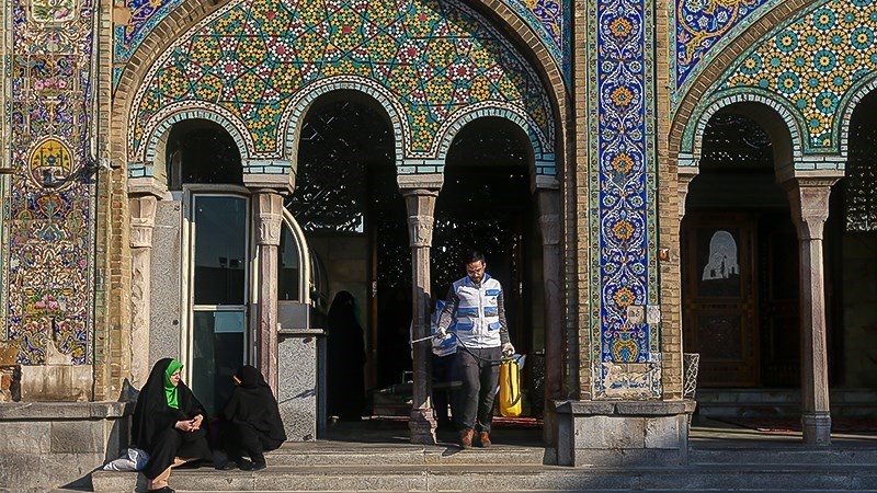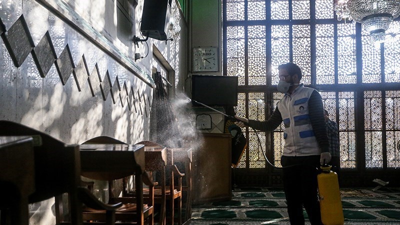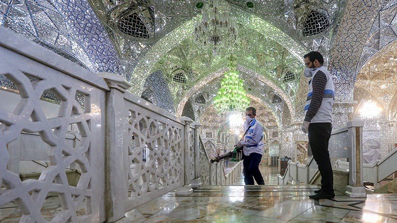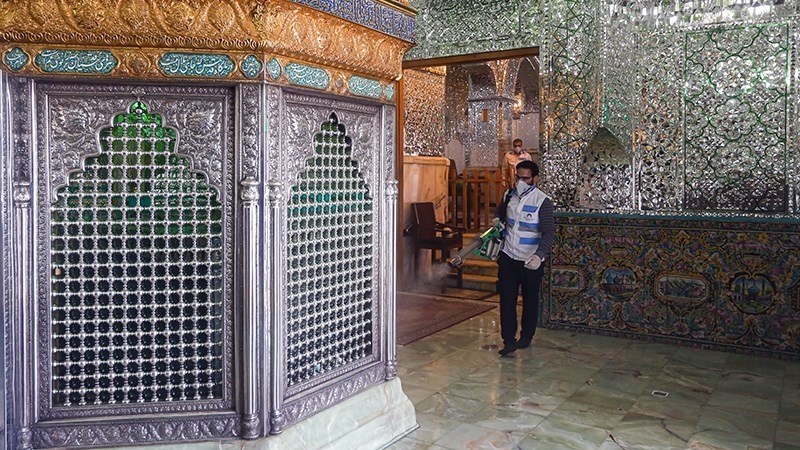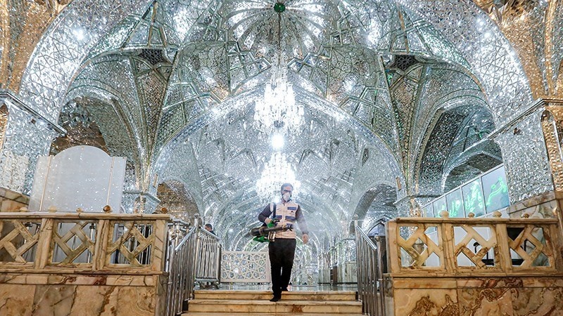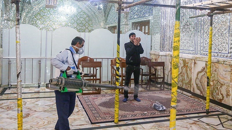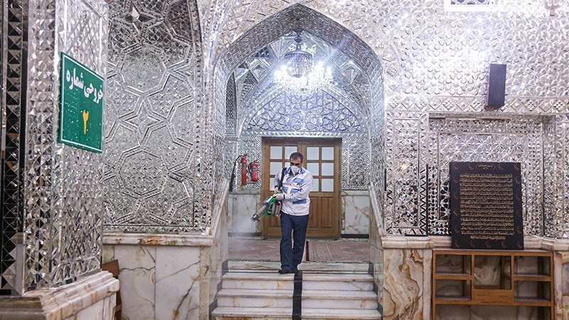 Kompleks Makam Shah Abdul Azim Hasani termasuk bagian Mushala disemprot disinfektan untuk mencegah penyebaran Virus Corona.