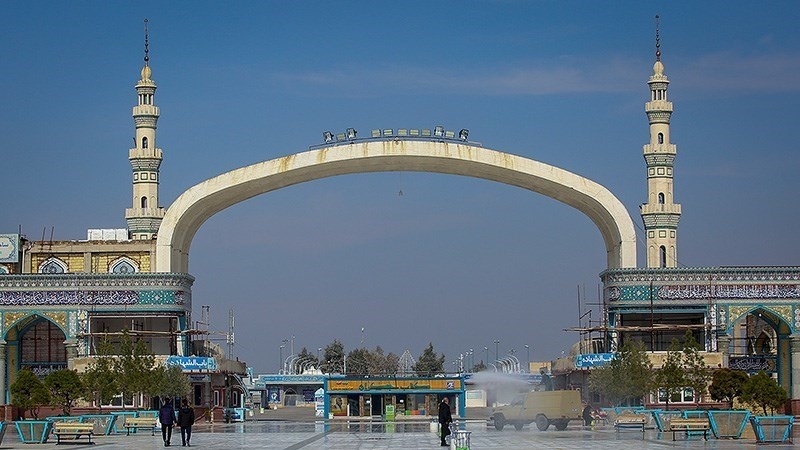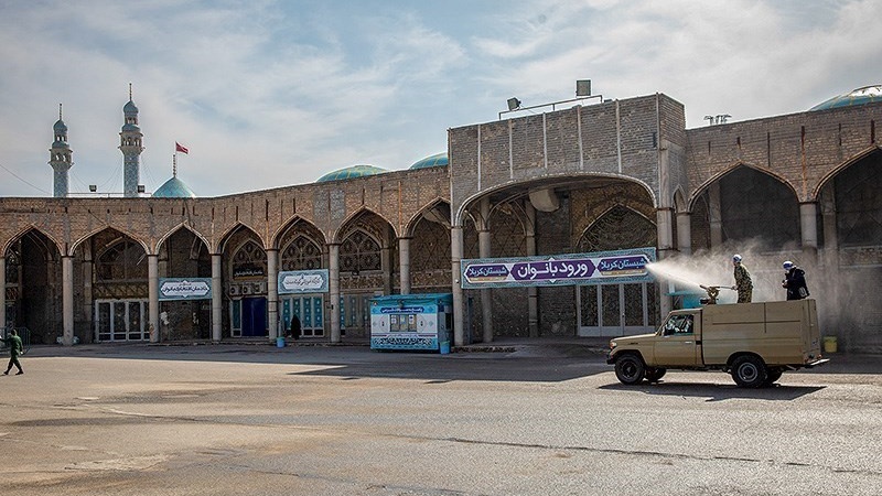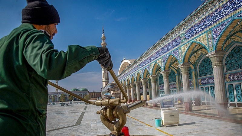 Tempat-tempat umum seperti masjid dan tempat ziarah, pasar, taman dan jalan-jalan di kota Qom, Republik Islam Iran disemprot disinfektan untuk mencegah penyebaran Virus Corona (COVID-19).