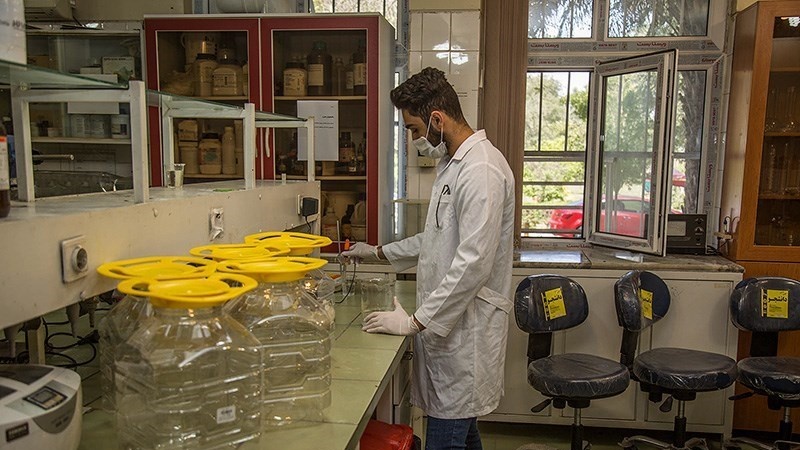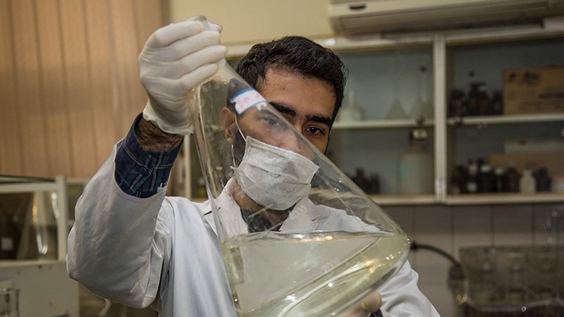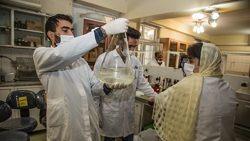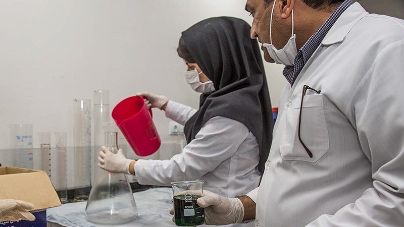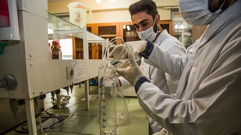 Anggota-anggota fakultas, apoteker dan mahasiswa Fakultas Farmasi Universitas Ilmu Kedokteran Ahvaz di Provinsi Khuzestan memproduksi alkohol dan cairan disinfektan untuk dibagikan ke rumah sakit-rumah sakit yang memerlukan.