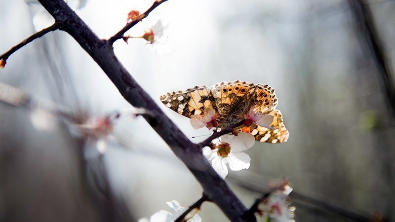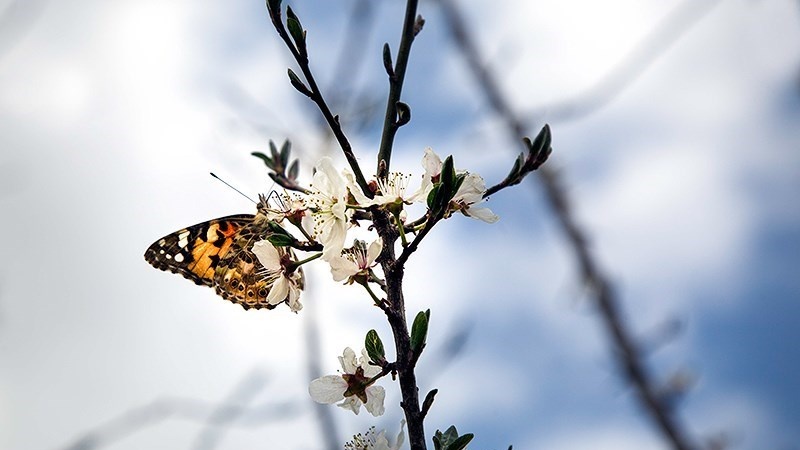 Bunga-bunga indah dari berbagai jenis pohon dan tumbuhan tampak mekar dan berwarna-warni. Kupu-kupu juga hinggap di bunga-bunga itu.