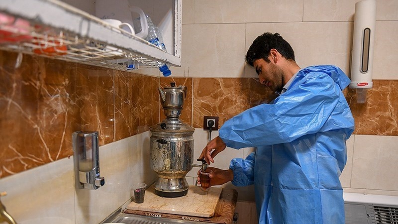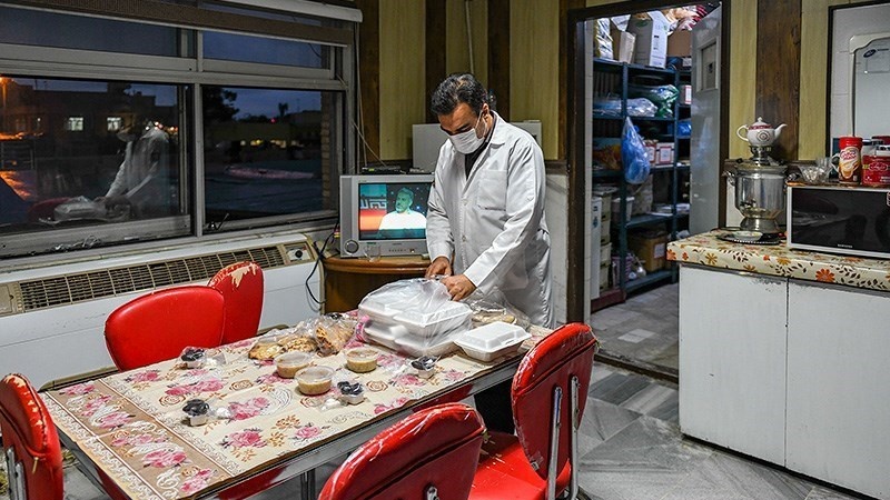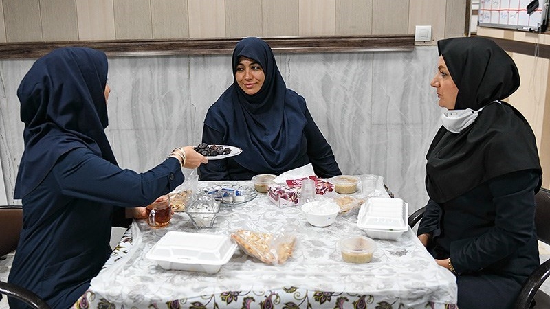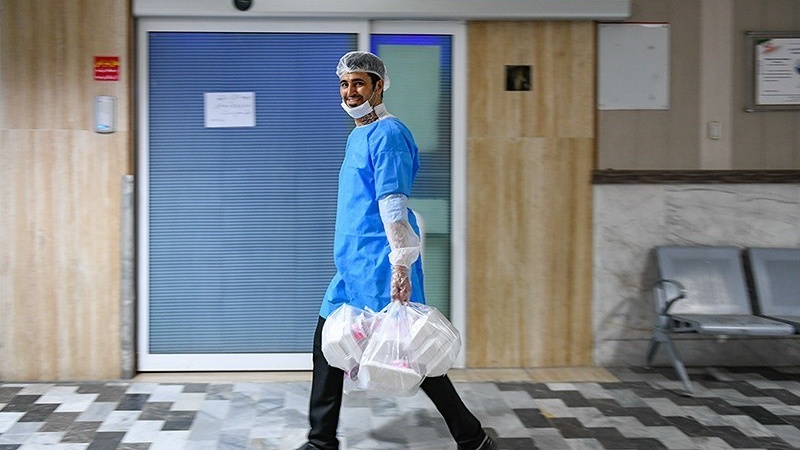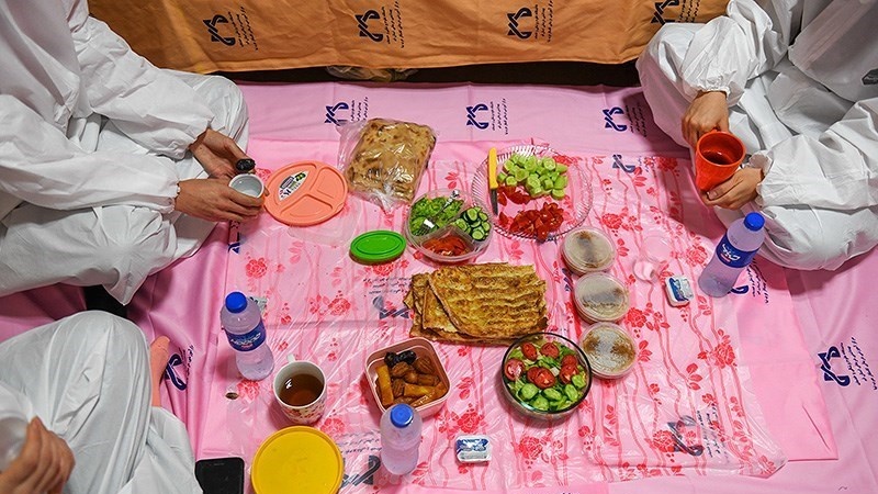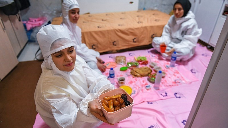 Perawat, dokter, staf medis dan petugas keamanan di rumah sakit Kamkar Arabnia Qom, Republik Islam Iran berbuka puasa bersama di sela-sela tugas mereka dalam merawat pasien yang terinfeksi virus Corona, COVID-19.