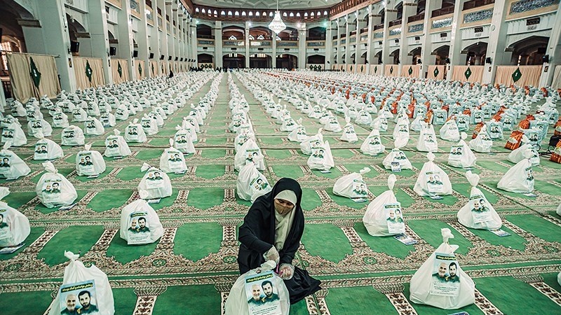 Puluhan ribu paket sembako disiapkan di Mushalla Besar Imam Khomeini ra Tabriz di Provinsi Azerbaijan Timur, barat laut Republik Islam Iran, Minggu, 10 Mei 2020.