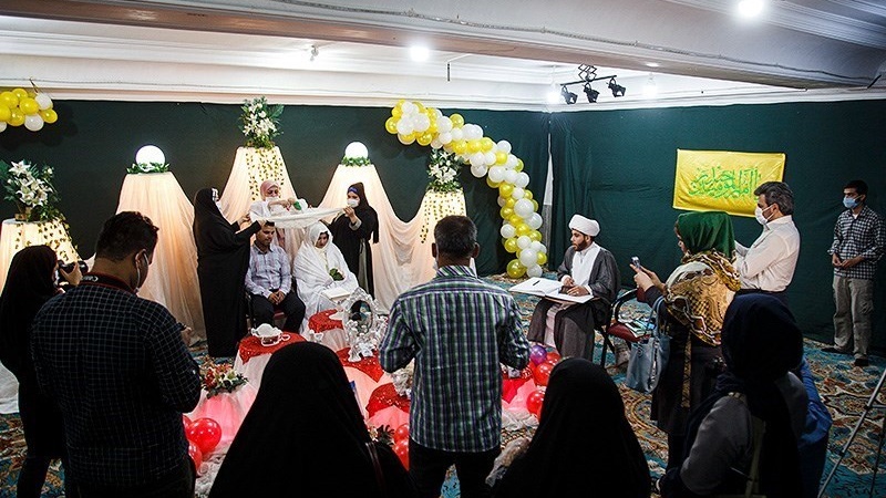 Tiga pasang pengantin melangsungkan acara khutbah nikah pada Hari Raya Ghadir Khum di aula Masjid al-Ghadir Ahvaz, Republik Islam Iran, Sabtu (8/8/2020).