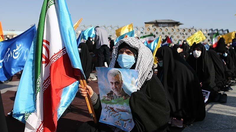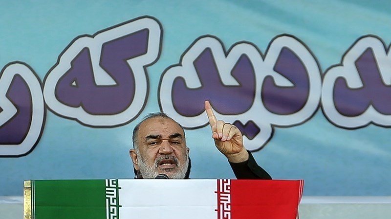 Komandan Korps Garda Revolusi Islam Iran (IRGC) Brigadir Jenderal Hossein Salami menyampaikan orasi di tengah massa yang berkumpul di Bundaran Imam Husein as di kota Tehran.