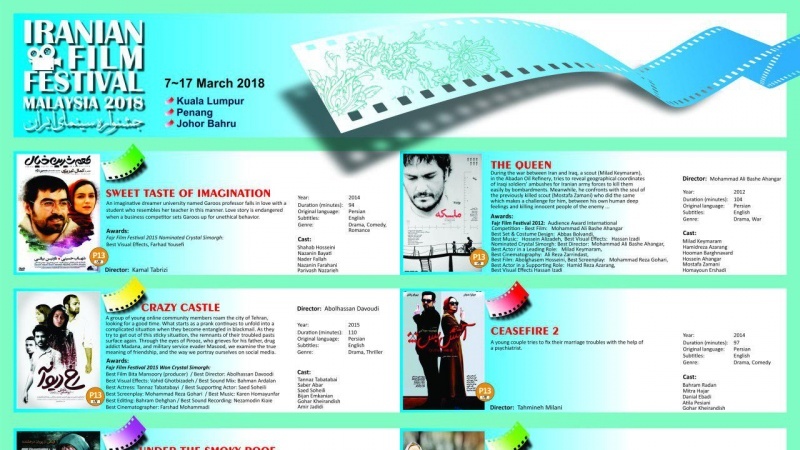 Festival Film Iran Pertama di Malaysia digelar hingga tanggal 17 Maret 2018 dan menampilkan enam film dan dua kelompok seniman Iran. Festival ini diselenggarakan di tiga kota Malaysia; Kuala Lumpur, Penang and Johor Bahru.
