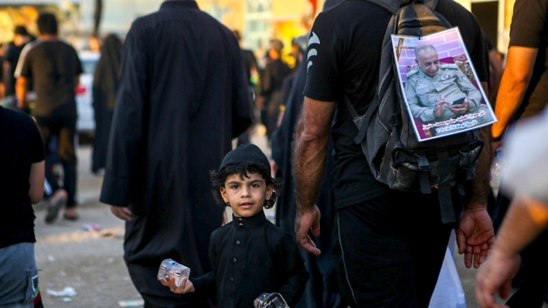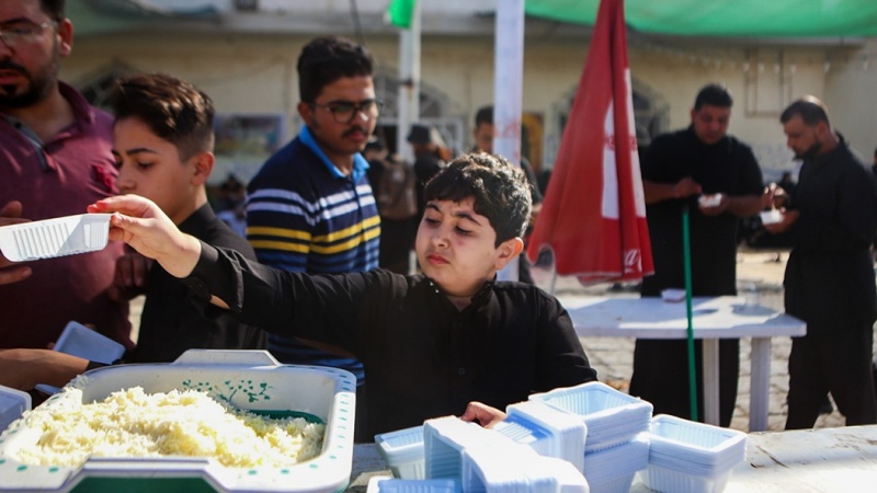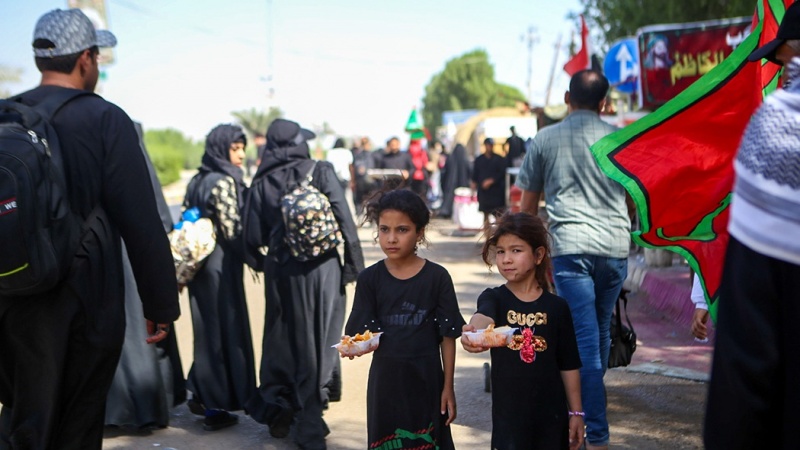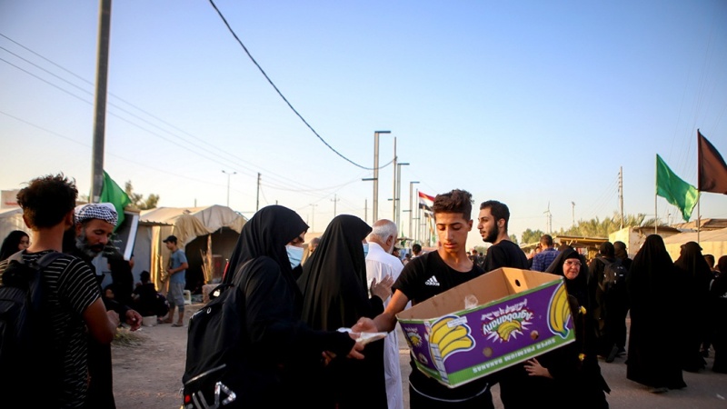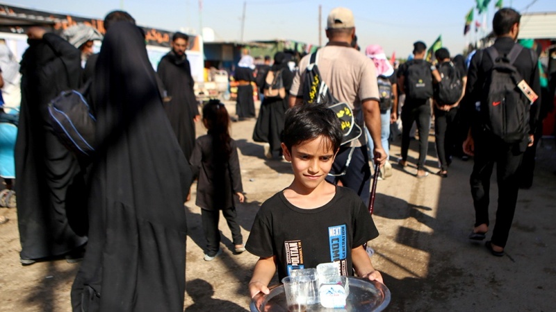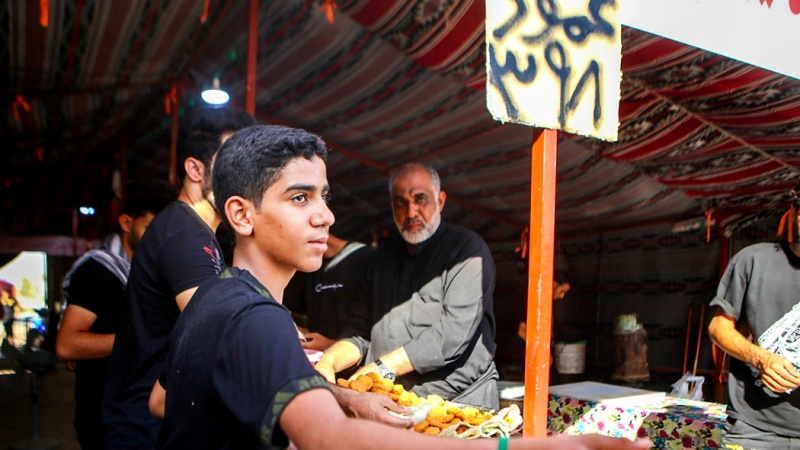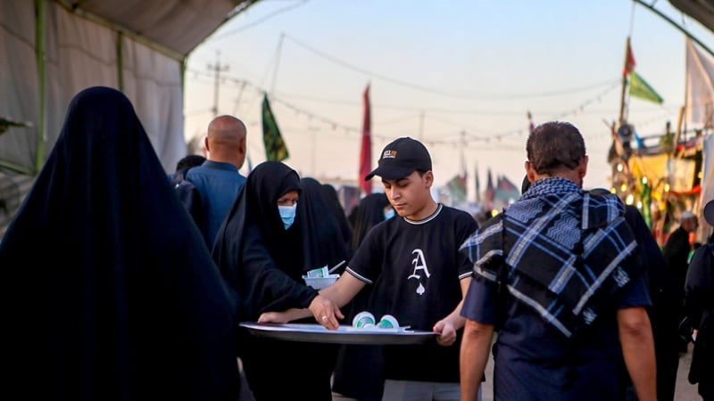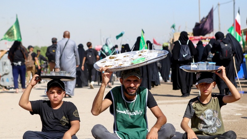 Anak-anak dan remaja Irak menawarkan makanan dan minuman kepada peziarah dari pagi hingga malam dengan penuh semangat.