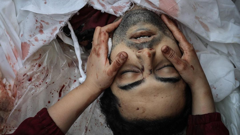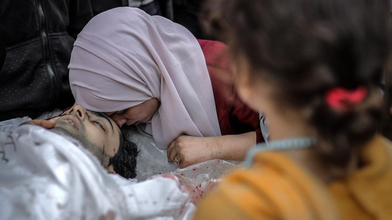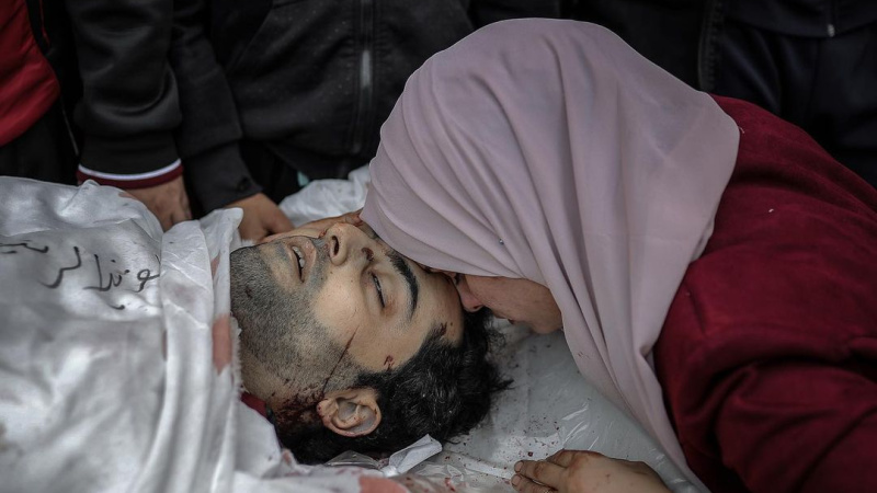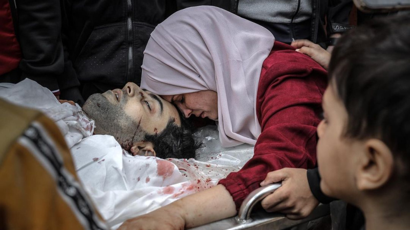 Seorang istri mengucapkan selamat tinggal kepada suaminya yang gugur akibat pemboman Israel di Khan Younis, Gaza selatan.