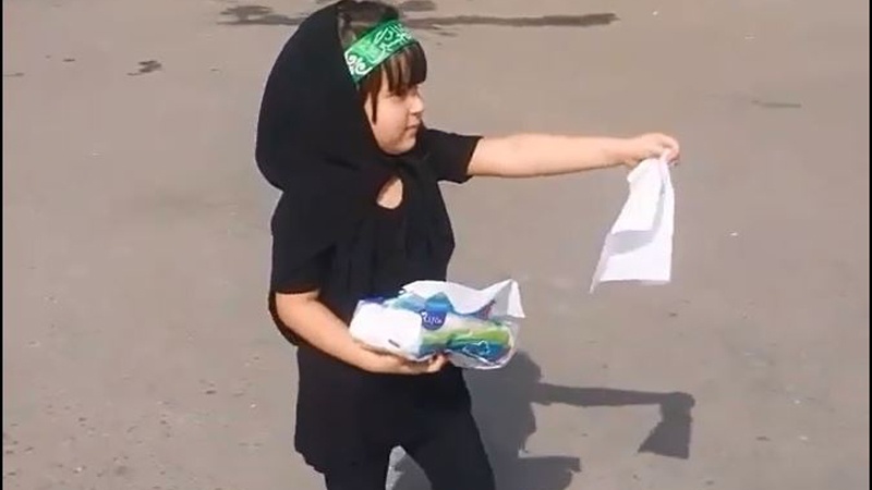 Terlihat seorang anak kecil menawarkan tisu kepada para peziarah. sebelumnya, anak-anak dan warga Irak berlomba-lomba menawarkan minuman, buah dan makanan gratis kepada para peziarah Arbain yang datang dari berbagai daerah Irak dan negara-negara Muslim lainnya menuju ke Karbala.