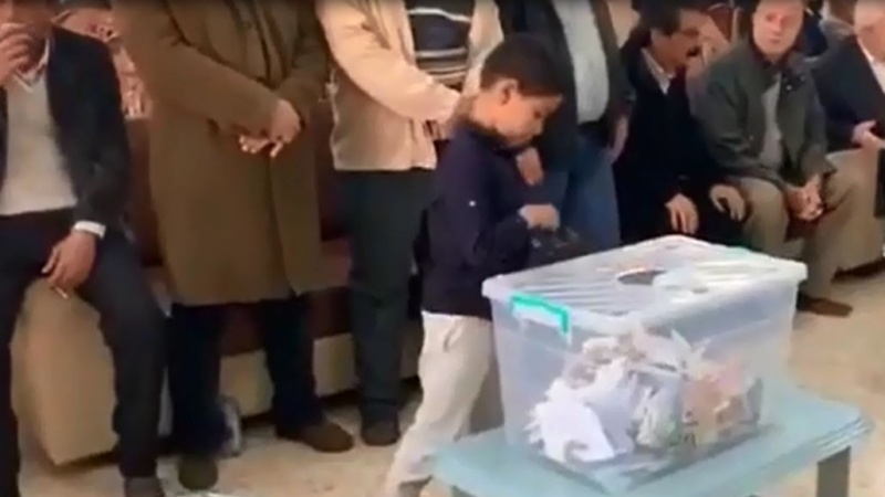 Seorang anak Palestina memasukkan uang ke dalam kotak sumbangan yang disediakan sebagai bentuk kampanye untuk membangun kembali rumah Syahid Ashraf Na'alwa yang dihancurkan oleh pasukan rezim Zionis Israel. Sabtu, 22 Desember 2018. (RA)