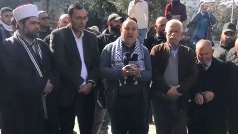 Puluhan orang melakukan aksi di gerbang Kompleks Masjid al-Aqsa untuk mengungkapkan solidaritas kepada para pengelola dan penjaga tempat suci ini yang dilarang masuk oleh pasukan rezim Zionis Israel, Selasa, 22 Januari 2019. (RA)