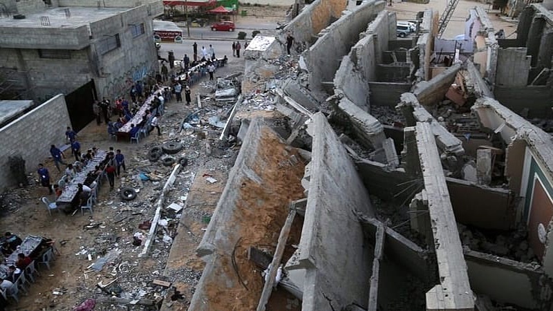 Puluhan warga Palestina berbuka puasa bersama dekat puing-puing bangunan yang baru-baru ini hancur akibat serangan udara rezim Zionis Israel ke Jalur Gaza, Sabtu, 18 Mei 2019.
