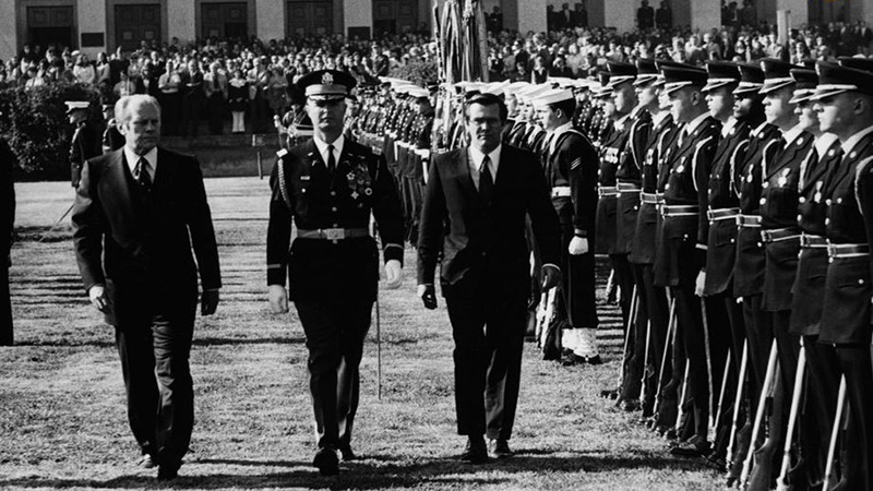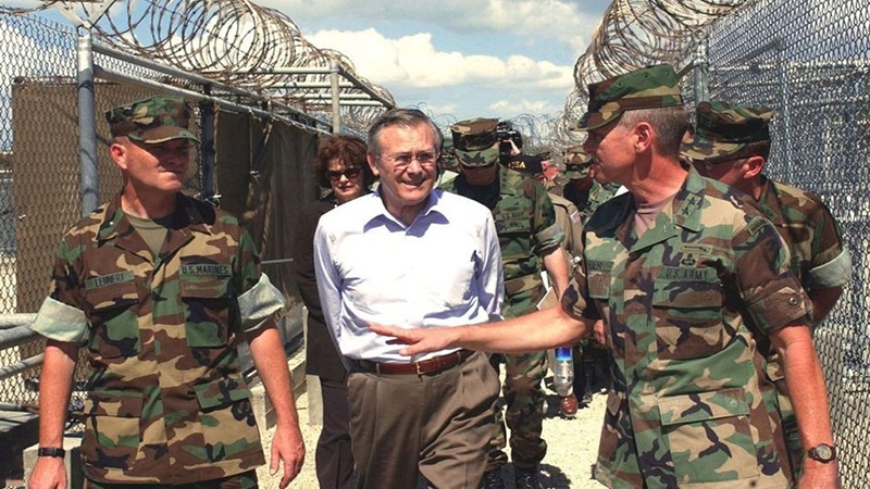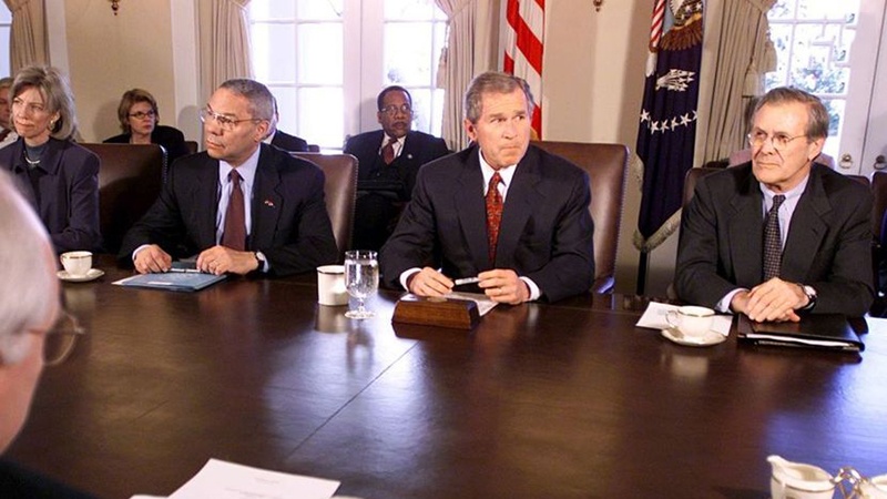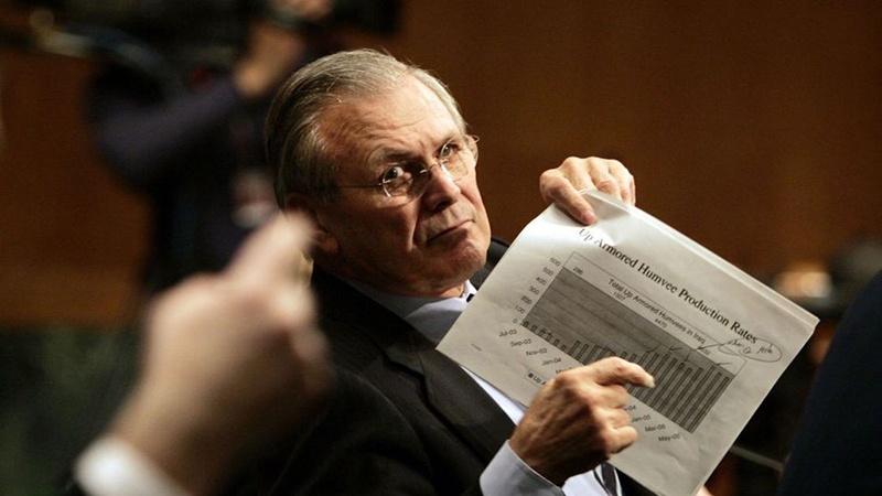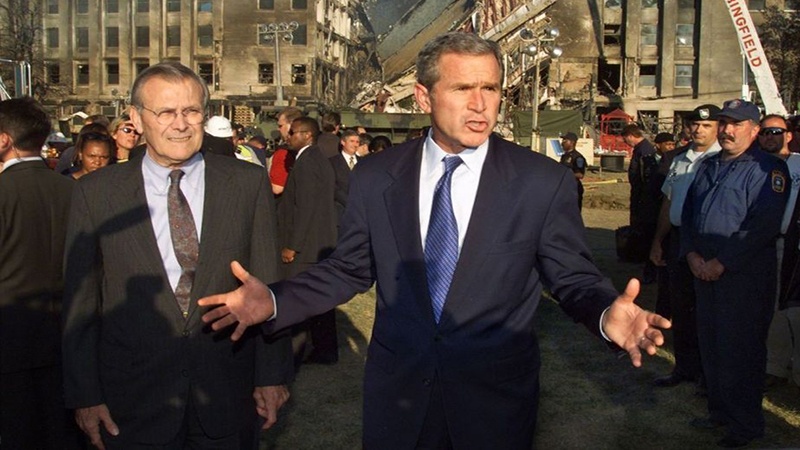 Donald Rumsfeld memimpin Pentagon saat pengambilan keputusan pemerintah Georga W Bush, mantan presiden Amerika untuk menyerang dan memulai invasi ke Afghanistan dan Irak.