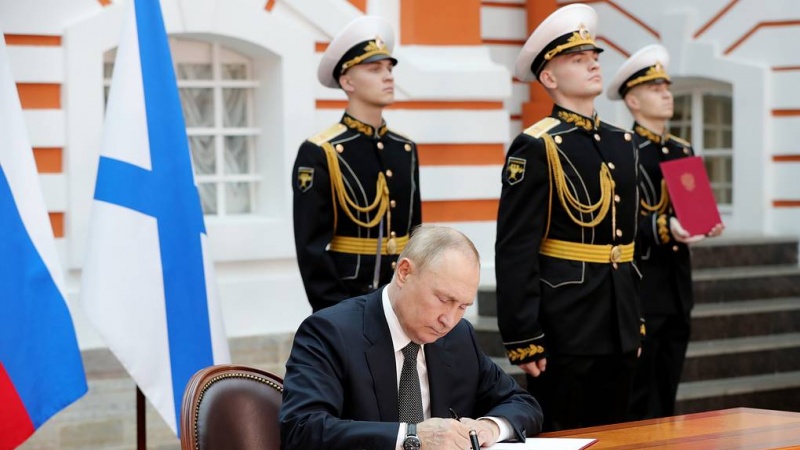 Presiden Rusia, Vladimir Putin Jumat (30/9/2022) di acara yang dihadiri empat pemimpin wilayah Ukraina, menandatangani dokumen bergabungnya wilayah ini ke Rusia.